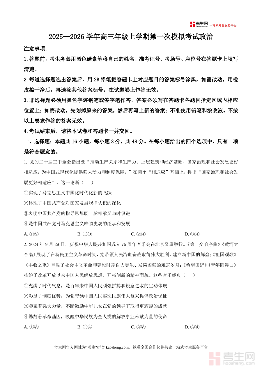 《精品解析:2026届河南省郑州市宇华实验学校高三上学期第一次模拟考试政治试题(原卷版)》是一份针对2026届河南省郑州市宇华实验学校高三学生开展上学期第一次模拟考试的政治学科备考资料。从文件名及内容片段可知,该考试属于2025—2026学年高三年级上学期阶段性检测类考试类型,旨在为相关学生提供贴合本校教学进度与考试要求的原卷形式资料,确保资料与该校高三政治学科教学实际及模拟考试安排高度匹配,满足阶段性备考基础需求。