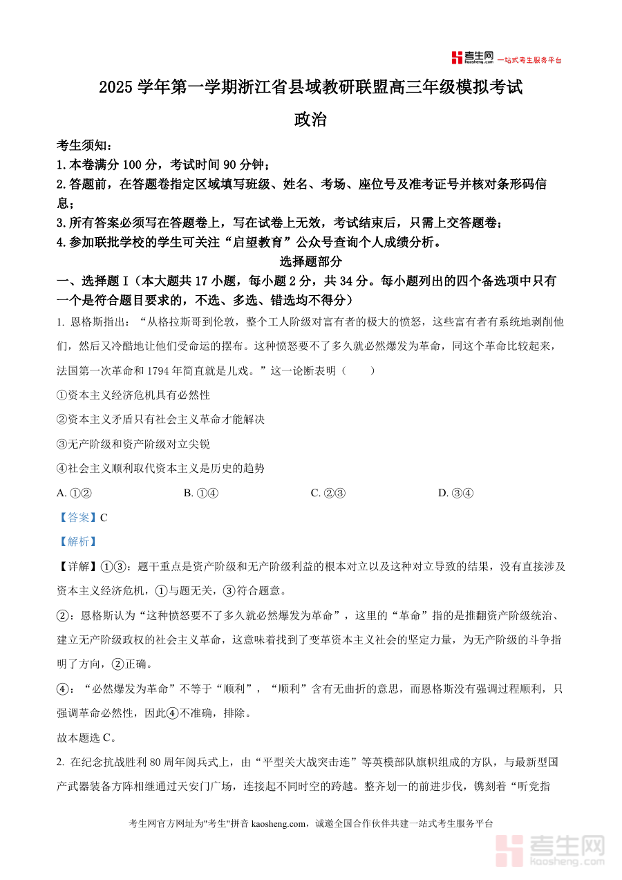 精品解析2026届浙江省县域教研联盟高三上学期模拟。考试政治试题解析版docx是一份针对特定阶段考试的。备考资料核心围绕考试的时间地区与用途展开为考生提供。阶段检测与备考参考这份资料的核心用途在于帮助对应年。级的学生明确学习重点通过阶段考试诊断学情为后续复习。规划提供依据无论是开学摸底阶段检测还是。