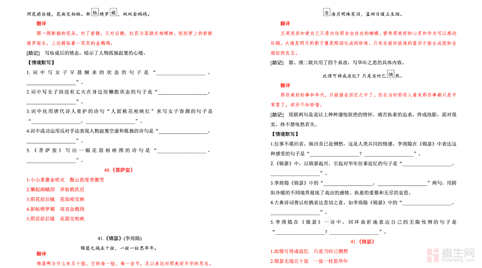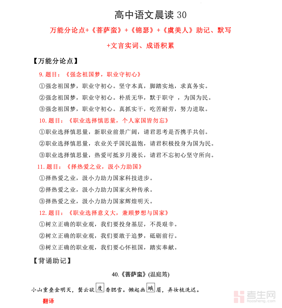 【激情晨读】古诗文知识与热点主题语段积累(新高中语文课标 60 篇)(菩萨蛮 + 锦瑟 + 虞美人)紧扣新高中语文课标 60 篇必背古诗文要求,聚焦菩萨蛮、锦瑟、虞美人三篇经典诗词,系统梳理文言注释、意象意境、情感主旨、艺术手法、名句默写等高考核心考点,结合高中语文热点主题整理优质语段与写作素材,内容简洁凝练、适合每日晨读记忆。帮助学生高效夯实诗词基础,提升鉴赏能力与语段积累水平,贴合高中语文日常学习与高考备考需求,助力语文成绩稳步提升。请添加微信 18617049513 进专属群,获取更多免费资源!