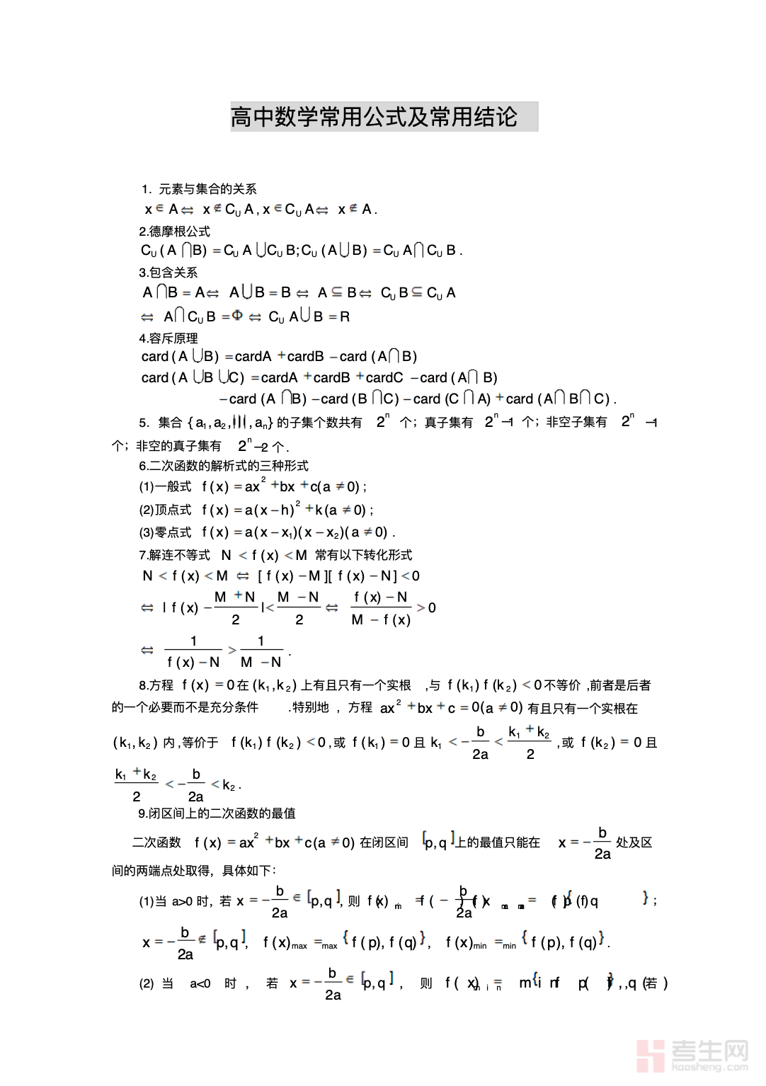高中数学核心公式结论手册系统梳理高中数学全学段核心公式、二级结论、定理推论,覆盖函数、导数、三角、数列、立体几何、解析几何、概率统计等七大模块核心考点,按章节与题型进行科学分类,条理清晰、重点突出。手册精选高考高频考查公式与实用结论,标注易错点、适用条件、推导思路,帮助学生快速记忆、精准运用,告别公式死记硬背。内容兼具基础夯实与提优拔高,适合日常学习、专题复习与高考冲刺,高效提升解题速度与得分能力,是高中数学备考必备的实用工具书。请添加微信 18617049513 进专属群,获取更多免费资源!
