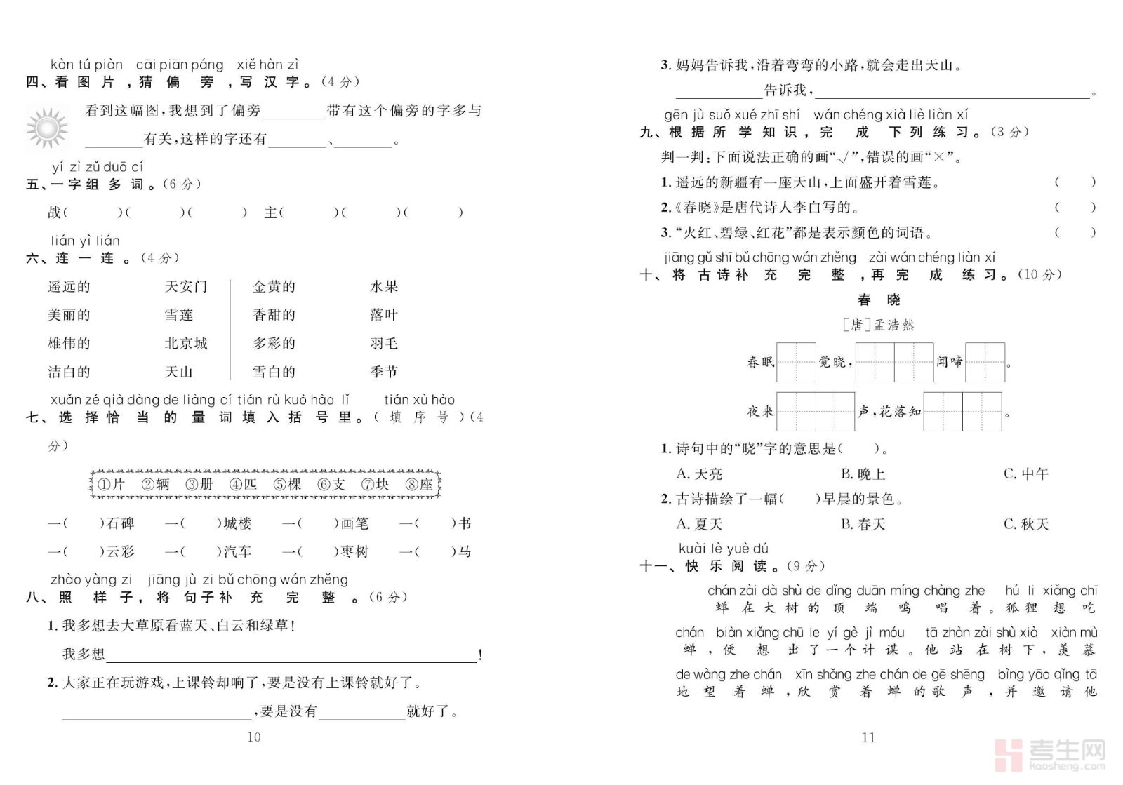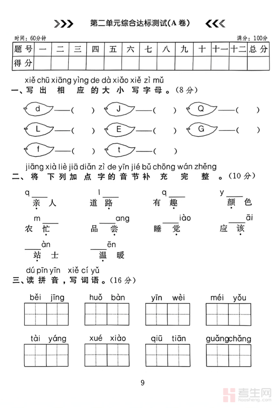 小学语文 第二单元测试卷(一年级下册)严格依据部编版一年级下册语文教材编写,紧扣第二单元生字词、句子练习、课文理解、口语交际等核心知识点,题型全面规范,包含看拼音写词语、形近字辨析、照样子写句子、课内阅读等基础考点,难度贴合一年级学生学习水平,适合单元复习、课堂检测与家庭练习。试卷注重基础知识巩固与语文素养培养,能有效检验孩子本单元学习效果,帮助查漏补缺、强化薄弱环节,提升识字写字、阅读理解与语言表达能力,是一年级下册语文单元同步学习与巩固提升的实用练习资料。请添加微信 18617049513 进专属群,获取更多免费资源!