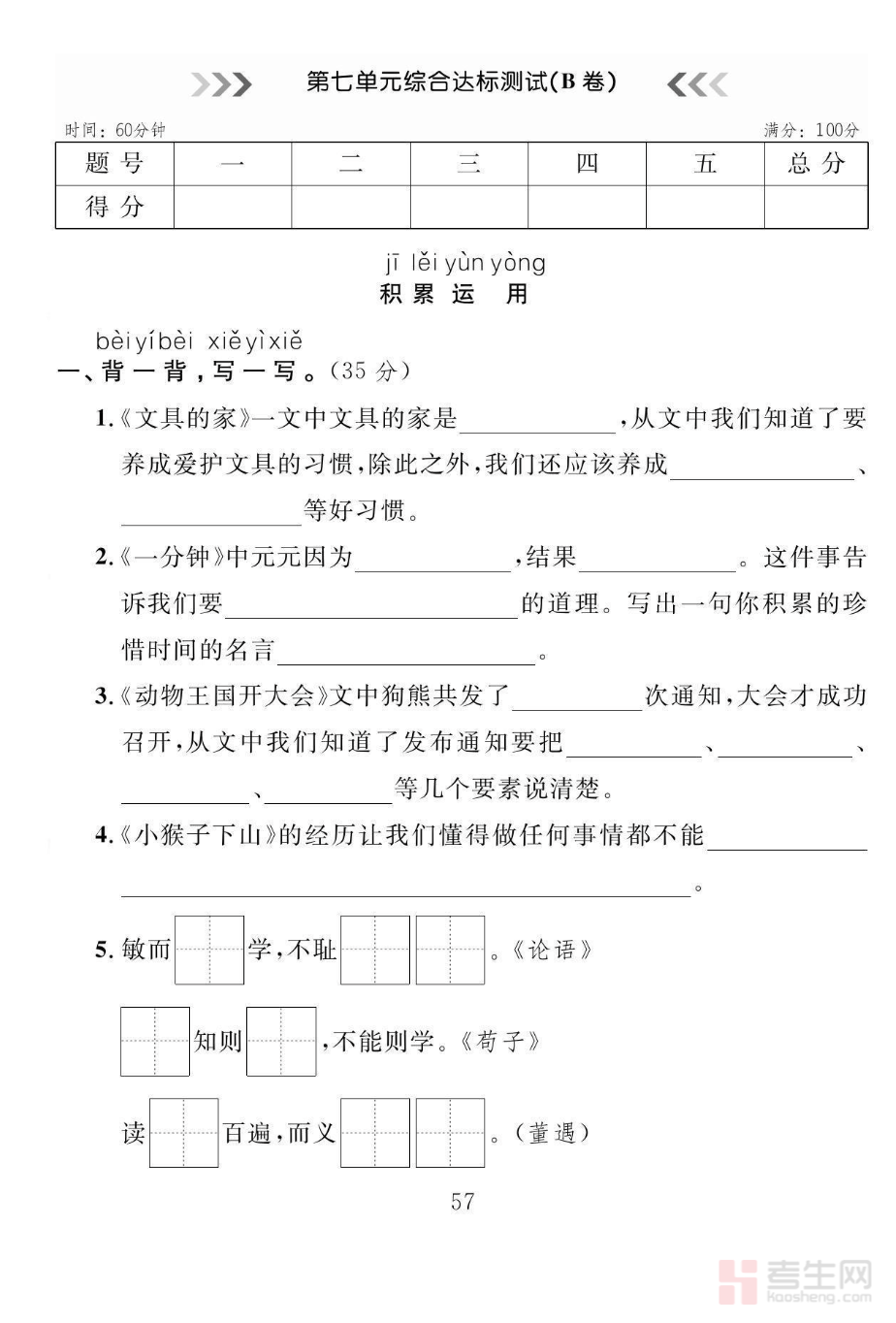小学语文 第七单元测试卷(一年级下册)严格按照部编版一年级下册语文教材编写,精准覆盖第七单元生字认读、词语积累、课文背诵、句子运用、阅读理解等核心考点,题型全面贴近低年级考试要求,包含看拼音写词语、形近字辨析、补充句子、课内阅读、简单表达等常考题型,难度适中、重点突出。试卷适合单元检测、课后练习、家庭作业、考前复习使用,能够有效检测孩子本单元的学习效果,帮助查漏补缺,夯实识字写字、语言表达与基础阅读能力,提升低年级语文综合素养,是同步学习与巩固提升的优质练习资料。请添加微信 18617049513 进专属群,获取更多免费资源!