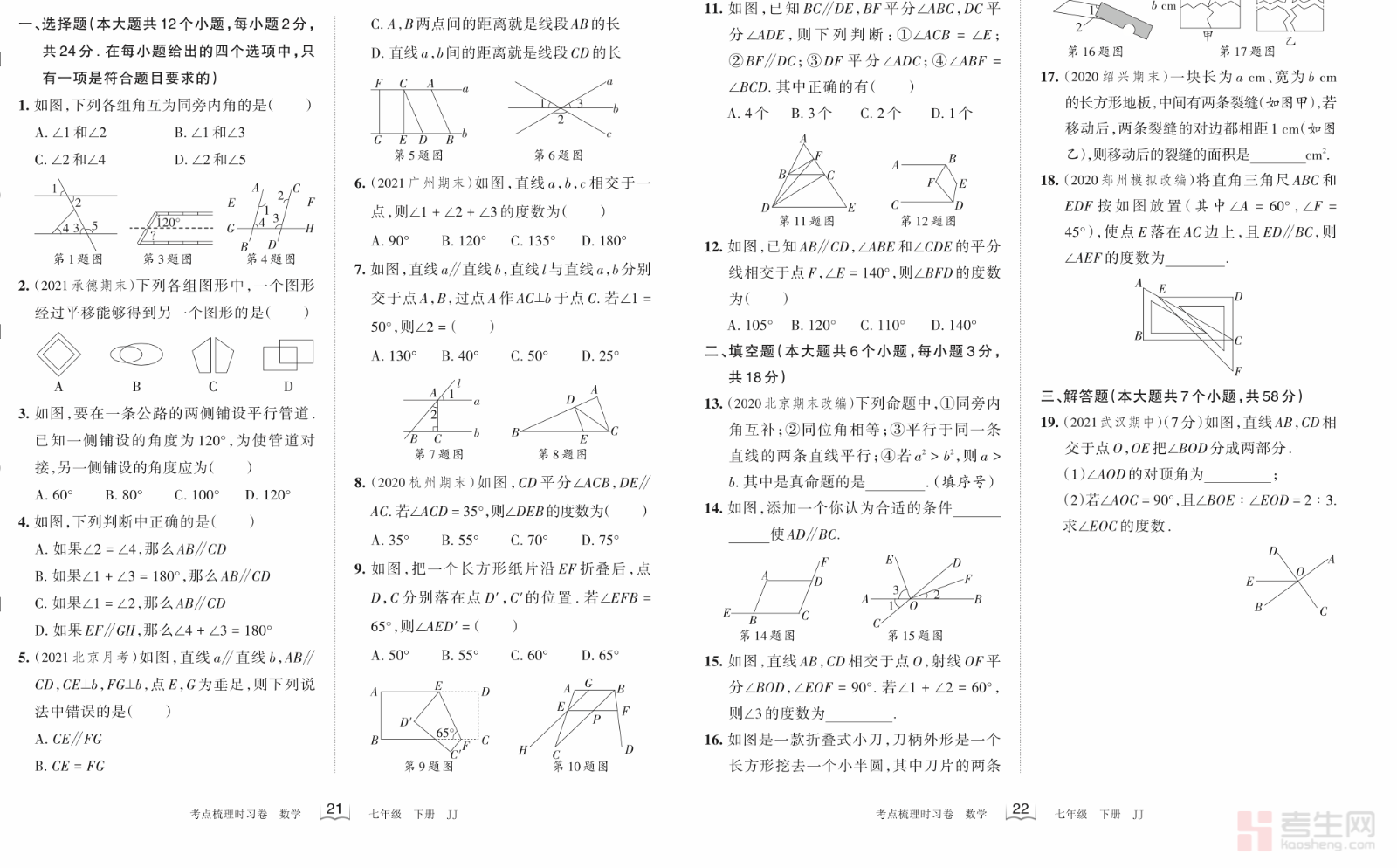 王朝霞 初中数学 第七章 过关检测卷(二)(冀教版)(七年级下册)(含答案解析)严格对照冀教版七年级下册数学第七章知识点编写,全面覆盖相交线与平行线、命题与证明、同位角内错角同旁内角、平行线的判定与性质等核心考点,题型包含选择、填空、解答等常考形式,难度贴合单元测试标准,结构合理、考点均衡。试卷注重基础巩固、几何推理、逻辑表达、答题规范训练,每道题都配有详细答案解析,明确解题思路与步骤要点,帮助学生快速查漏补缺、强化几何思维。适合单元过关检测、课堂练习、课后巩固、考前复习使用,有效夯实七年级数学几何基础,提升解题与应试能力。请添加微信 18617049513 进专属群,获取更多免费资源!