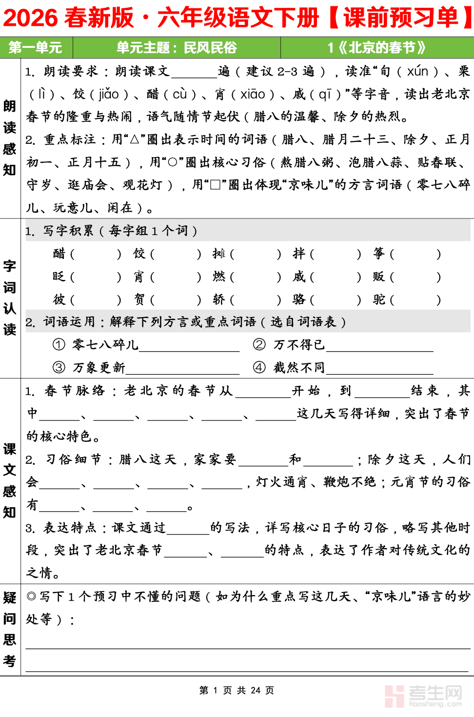 小学语文 课前预习单 第一单元(六年级下)紧扣部编版六年级下册语文第一单元教材内容,围绕单元主题、生字新词、重点语句、课文脉络、作者情感等核心预习要点设计,内容贴合课堂教学要求,层次清晰、实用性强。预习单包含生字注音、词语解释、课文梳理、问题思考、拓展积累等模块,帮助学生提前熟悉课文、扫清阅读障碍、培养自主预习习惯。重点强化课前感知、重点把握、疑点标注、基础夯实,让学生提前掌握学习重点,提高课堂听课效率。适合六年级学生课前自主预习、课堂同步学习、家长辅导使用,助力扎实打好语文学习基础。请添加微信 18617049513 进专属群,获取更多免费资源!