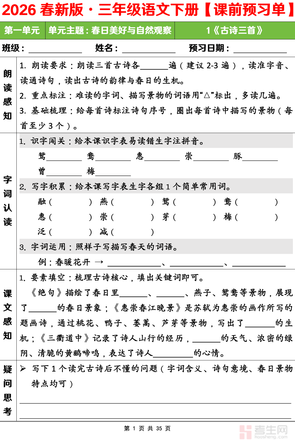 小学语文 课前预习单 第一单元(三年级下)紧扣部编版三年级下册语文第一单元教材内容,围绕生字认读、笔顺书写、词语积累、课文朗读、简单理解等基础预习要点设计,内容浅显易懂、针对性强,贴合三年级起步学习特点。预习单包含生字注音、组词练习、课文感知、重点词句梳理、课前小思考等模块,引导孩子提前熟悉课文,降低课堂学习难度,培养自主预习、认真识字、规范表达的良好习惯。帮助学生扎实打好语文基础,提升课堂听课效率,适合三年级学生课前预习、家长辅导、同步巩固使用。请添加微信 18617049513 进专属群,获取更多免费资源!