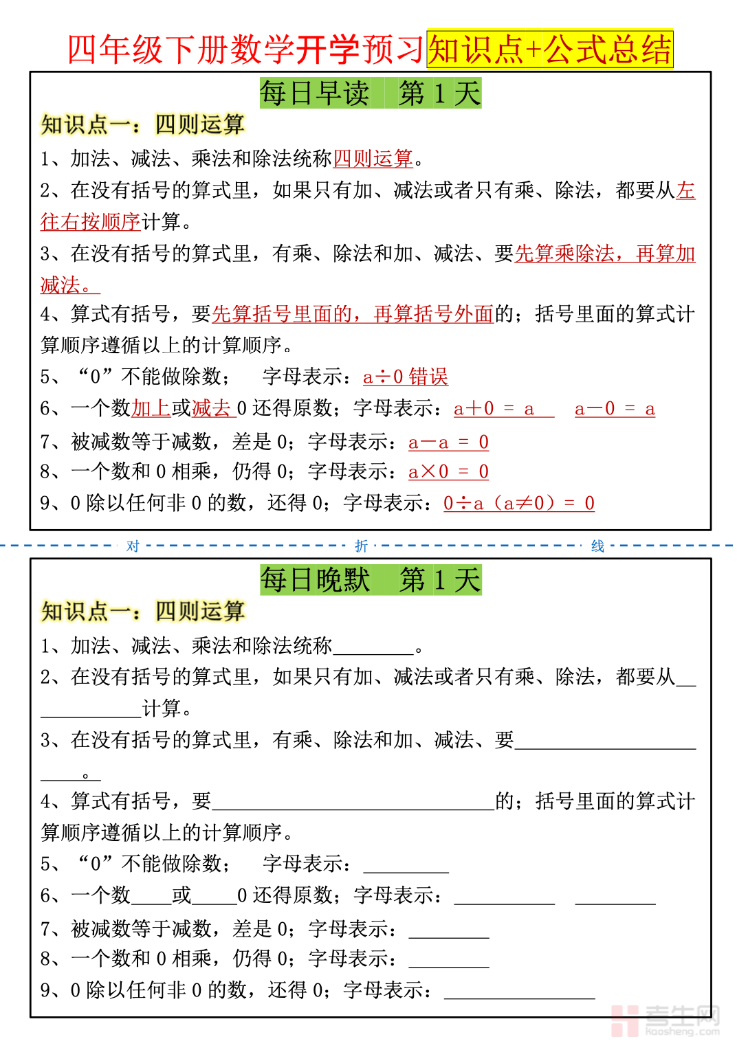 26 新小学数学每日晨读晚默课内重点(四年级下)依据 2026 最新教材与考试大纲编写,精准提炼四年级下册课内核心知识点、运算定律、小数意义与性质、三角形特征、单位换算等必记内容,采用晨读理解、晚默巩固的高效学习方式,帮助学生强化记忆、夯实数学基础。内容覆盖四则运算、运算定律、小数的意义和性质、三角形、小数加减法、图形与位置等全册重点,贴合课堂进度与考试高频考点,注重知识梳理、默写训练、易错提醒、基础过关,每天短时练习即可稳步提升数学基础与答题能力。适合四年级学生每日打卡、课前预习、课后复习、期中期末备考使用,轻松掌握课内重点,提升数学学习效率。请添加微信 18617049513 进专属群,获取更多免费资源!