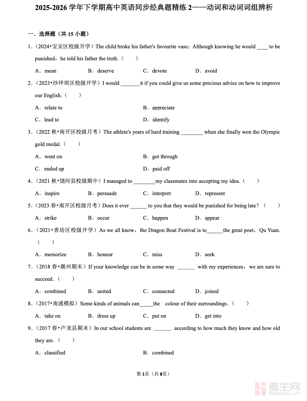 高中英语 同步经典题精练 2—— 动词和动词词组辨析(高一下)紧扣高一下教材同步知识点与高考考纲,聚焦动词词义辨析、动词短语固定搭配、近义动词区分、语境用法判断四大核心考点,精选同步经典题、易错题与高频考题,覆盖单选、语法填空、短文填空等常考题型,侧重语境理解、固定搭配记忆、用法区别、答题技巧训练,帮助学生彻底攻克动词易混难点。资料题型经典、解析详细、直击考点,适合高一下学生同步练习、语法巩固、错题突破、考前刷题使用,快速提升词汇运用与应试得分能力。请添加微信 18617049513 进专属群,获取更多免费资源!