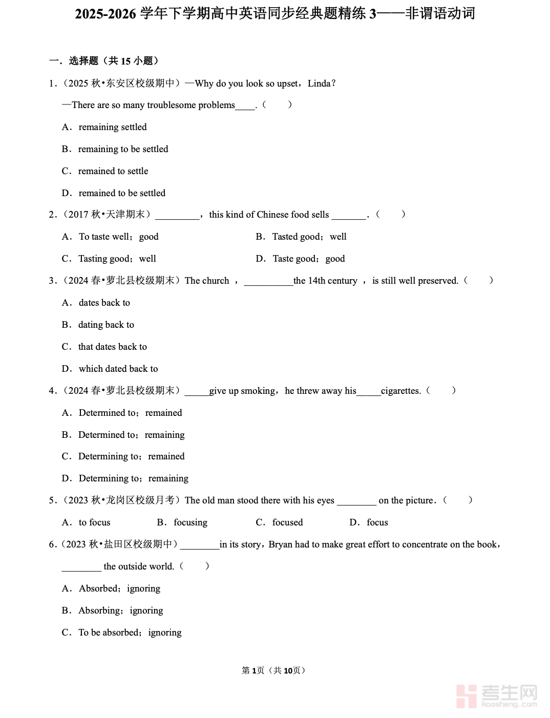 高中英语 同步经典题精练 3—— 非谓语动词(高一下)紧扣高一下学期英语教材与高考核心考点,系统梳理不定式、动名词、现在分词、过去分词四大非谓语动词知识点,精选同步经典题、易错题、高频考题进行分层训练,重点突破形式判断、句法功能、固定搭配、时态语态等易错难点。题型覆盖语法填空、单项选择、句型转换等高考常考题型,解析详细透彻,点明解题关键,适合高一下学生同步巩固、语法专项突破、考前刷题、错题订正使用,快速掌握非谓语动词用法,提升语法应用与应试能力。请添加微信 18617049513 进专属群,获取更多免费资源!