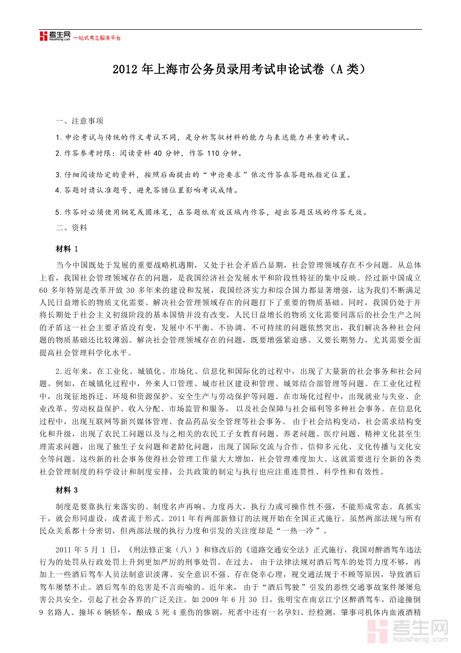 这份资料主要用于上海公务员考试申论科目的系统备考阶段,帮助备考者熟悉2012年上海公务员考试申论A卷的题型结构、考试形式以及答题规范要求。通过对真题的实际练习和参考答案的对照分析,备考者能够清晰把握考试的评分标准和答题思路,明确自身在申论写作、材料分析等方面的不足,进而调整备考策略、提升应试能力,为正式参加公务员考试做好充分准备。