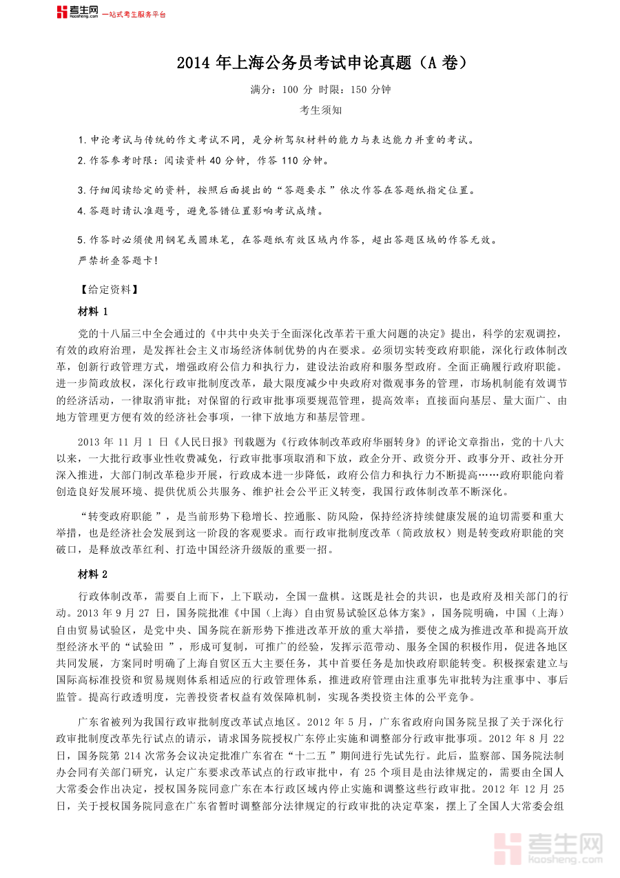 《2014年上海公务员考试《申论》真题(A卷)及参考答案.doc》是一份针对2014年度上海公务员招录考试申论科目A卷的专业备考资料。该资料包含当年上海公务员考试申论A卷的完整真题及配套参考答案,精准对应该年度上海公务员申论A卷的考查方向与命题特征,是了解该次考试内容与评分标准的核心参考载体。