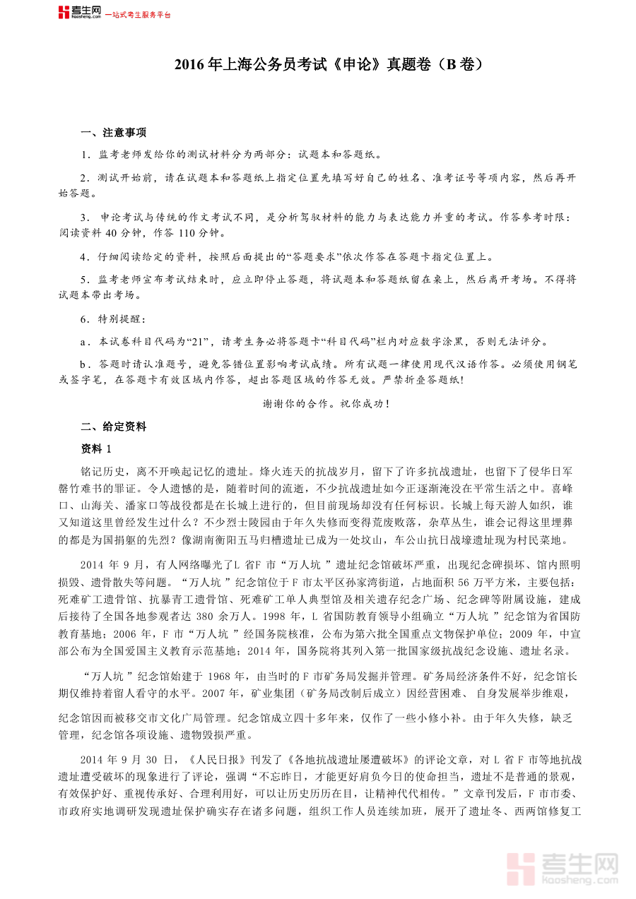 《2016年上海公务员考试《申论》真题(B卷)及参考答案.doc》是一份针对2016年上海公务员考试申论科目B卷的备考资料,包含该年度该类考试的真题及对应的参考答案,为考生提供了与当年考试实际情况高度契合的练习素材,是了解2016年上海公务员申论B卷考试特点的重要参考资源。