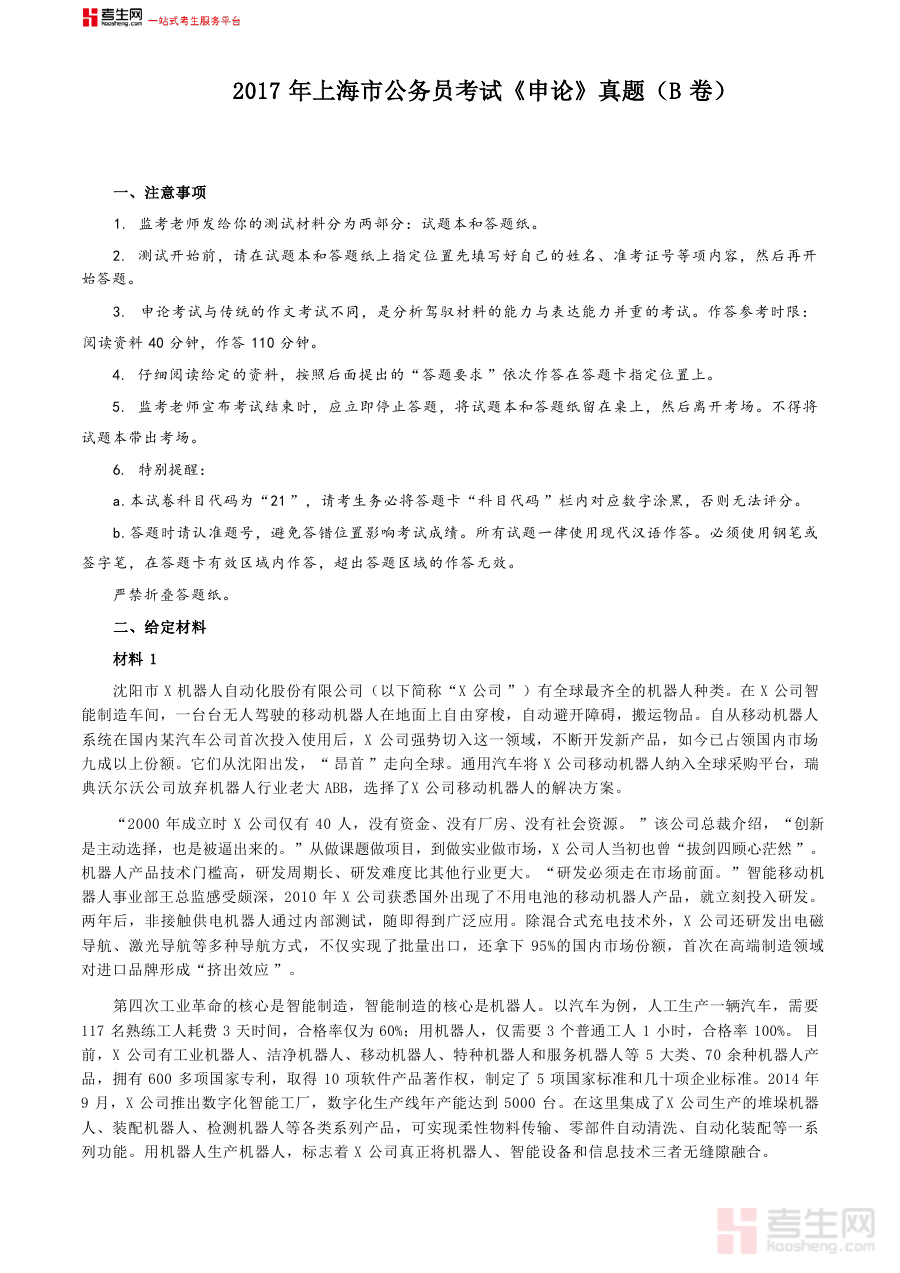 《2017年上海公务员考试《申论》真题(B卷)及参考答案.doc》是一份针对2017年上海公务员考试申论科目B卷的官方真题及配套参考答案资料,涵盖该年度上海公务员考试申论B卷的完整试题与权威解析,是反映当年考试命题方向与评分标准的重要备考资源,为考生提供了贴近真实考试场景的练习素材。