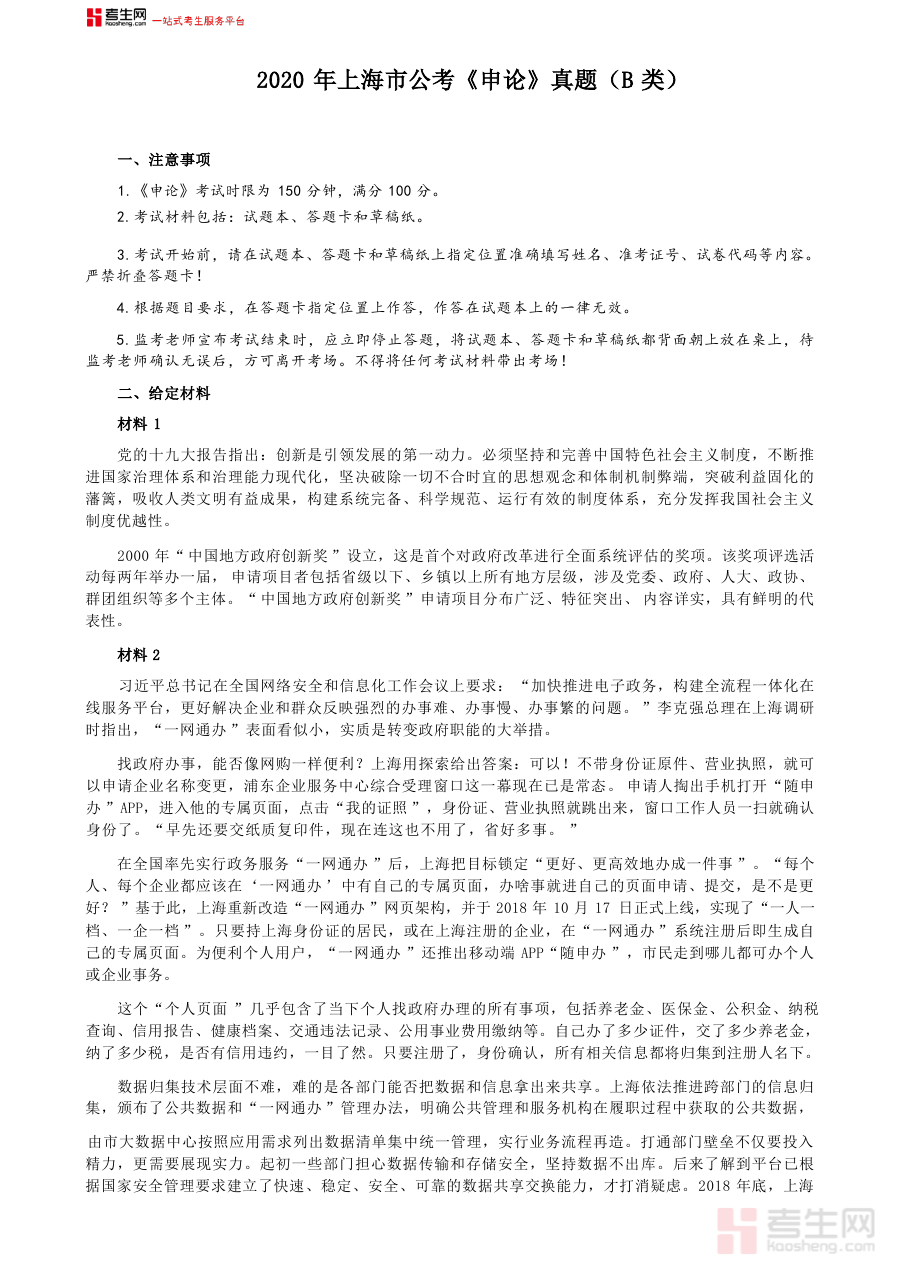 《2020年上海公务员考试《申论》真题(B类)及参考答案》是一份针对2020年度上海市公务员考试申论科目B类岗位的专业备考资料。该资料整合了当年公务员考试申论B类科目的真实试题与对应的参考答案,为考生提供了贴近实际考试场景的复习素材,助力考生把握考试的核心方向与基本要求。