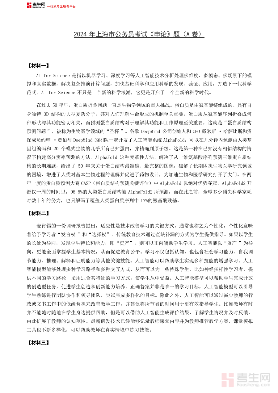 这份资料主要用于2024年上海市公务员考试申论A卷考生的系统备考环节。它能够帮助考生熟悉该考试A卷的题型框架与作答规范,了解考试的评分逻辑与答题方向,为考生提供贴近真实考试场景的模拟机会,助力考生在备考过程中精准定位自身薄弱点并开展针对性强化训练。同时,这份资料也可作为公务员考试辅导人员开展教学或指导工作的关键参考依据,辅助他们为考生制定更科学合理的阶段性备考计划。
