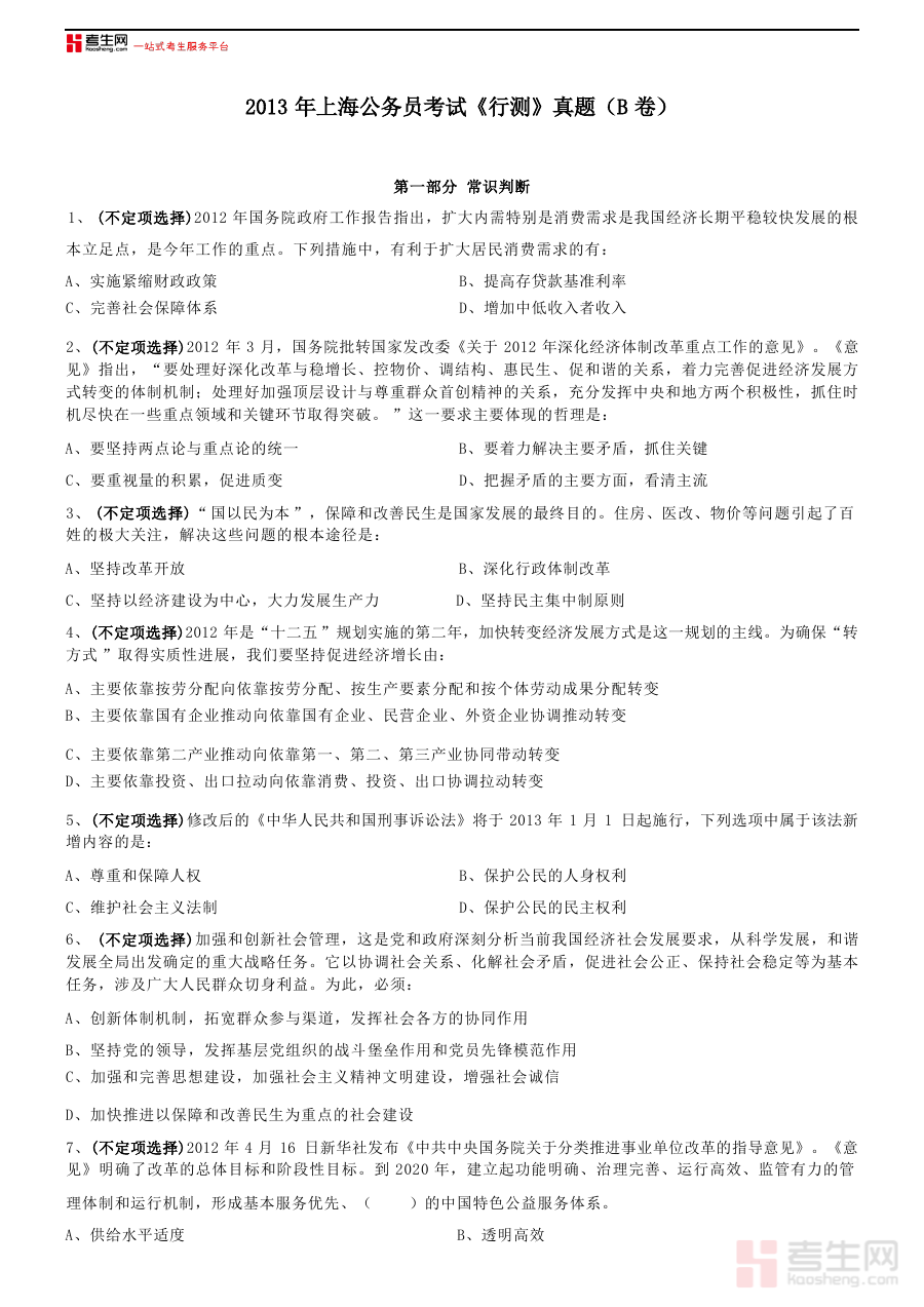 《2013年上海公务员考试《行测》真题(B卷)》是一份针对2013年度上海市公务员招录考试行政职业能力测验科目B卷的备考资料,它精准反映了该年度上海公务员考试行测B卷的命题背景与考试要求,是参与或研究该次考试的重要资料载体,能够帮助使用者直观了解当年上海公务员行测B卷的考试框架与核心方向,为相关备考活动提供真实且权威的参考依据。