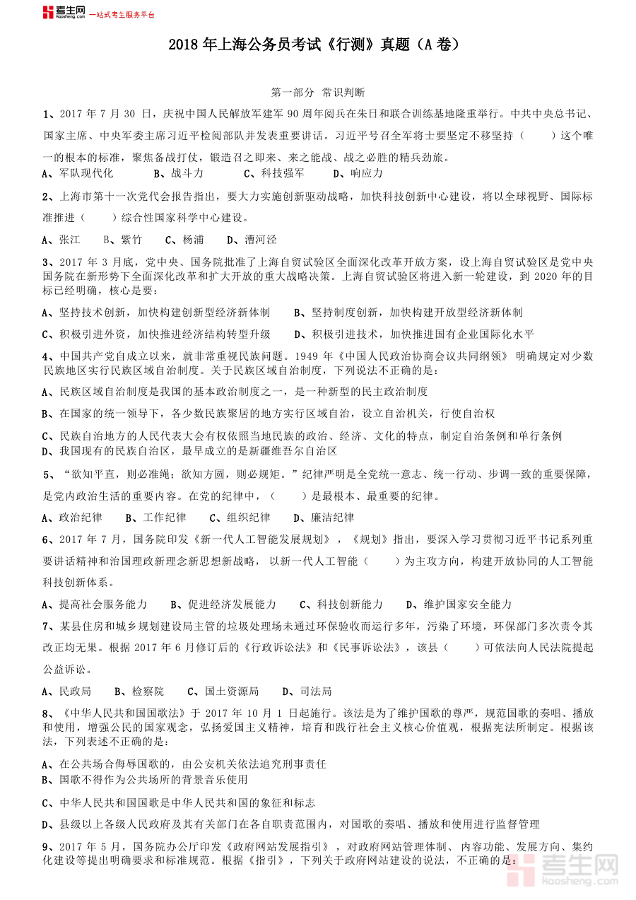 《2018年上海市公务员考试《行测》试卷(A卷)》是一份针对2018年度上海市公务员招录考试行政职业能力测验科目A类试卷的专业备考资料。该资料精准匹配上海地区公务员考试的特定要求,聚焦行测科目A卷的考查范畴,为考生提供了贴合当年考试实际情况的练习载体,是了解2018年上海公务员行测A卷考试形式与考查方向的重要参考资料。