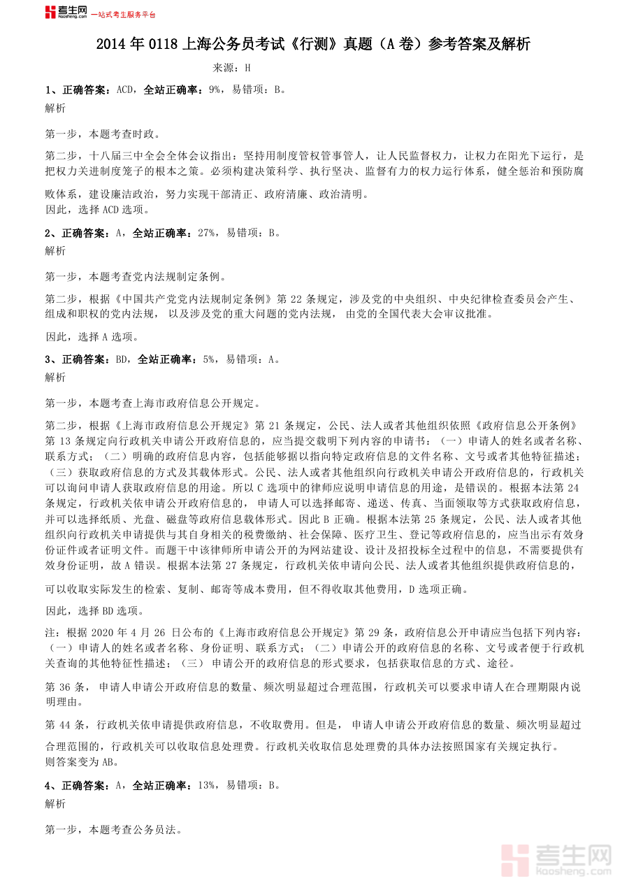 《2014年0118上海公务员考试《行测》真题(A卷)参考答案及解析》是一份针对2014年1月18日举行的上海公务员考试行政职业能力测验A卷真题的配套参考资料。它为考生提供该次考试行测A卷所有题目的答案及详细解析服务,是上海公务员考试备考过程中重要的辅助资料之一,能够帮助使用者快速获取该次真题的权威解答信息,为备考提供直接有效的参考依据。