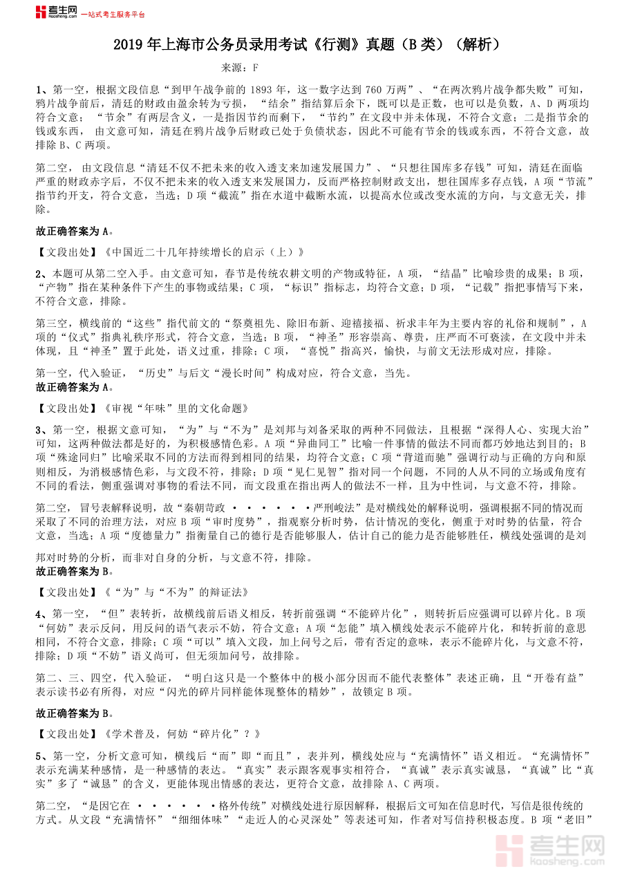 《2019年上海公务员考试《行测》试卷(B卷)答案及解析》是一份针对2019年上海市公务员考试行政职业能力测验B卷的专业备考辅助资料,精准对应该年度该地区公务员考试行测B卷的考查要求、试卷结构与命题方向。