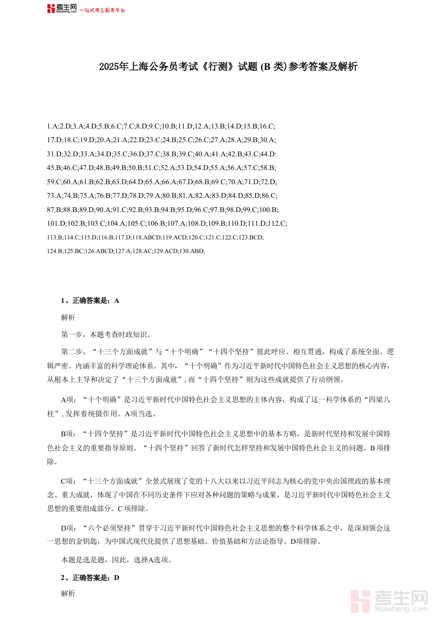 考生网是一站式考生服务平台,拥有唯一“考生”通用词拼音kaosheng.com,自带流量优势与品牌护城河。平台始终坚守发展普惠教育、促进教育公平的初心,致力于为广大考生提供优质、便捷的备考资源与服务,打造共创共享的知识分享平台。这份2025年上海公务员考试《行测》答案及解析(B类)正是平台为满足上海公务员考试B类考生的备考需求而推出的专业资料之一,旨在助力考生高效备考,提升考试竞争力。