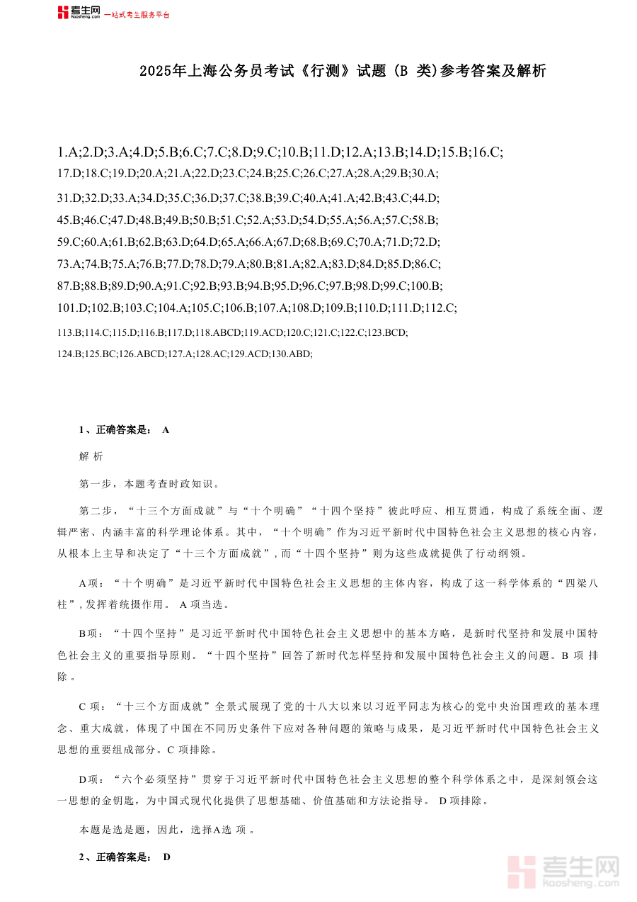 《2025年上海公务员考试《行测》试题(B类)答案及解析》是一份针对2025年上海市公务员考试行政职业能力测验(B类)科目的备考辅助资料,由考生网提供。该资料聚焦上海公务员考试B类行测科目的特定需求,旨在为考生提供对应试题的答案参考与解析说明服务,帮助考生了解考试的作答方向与思路框架。