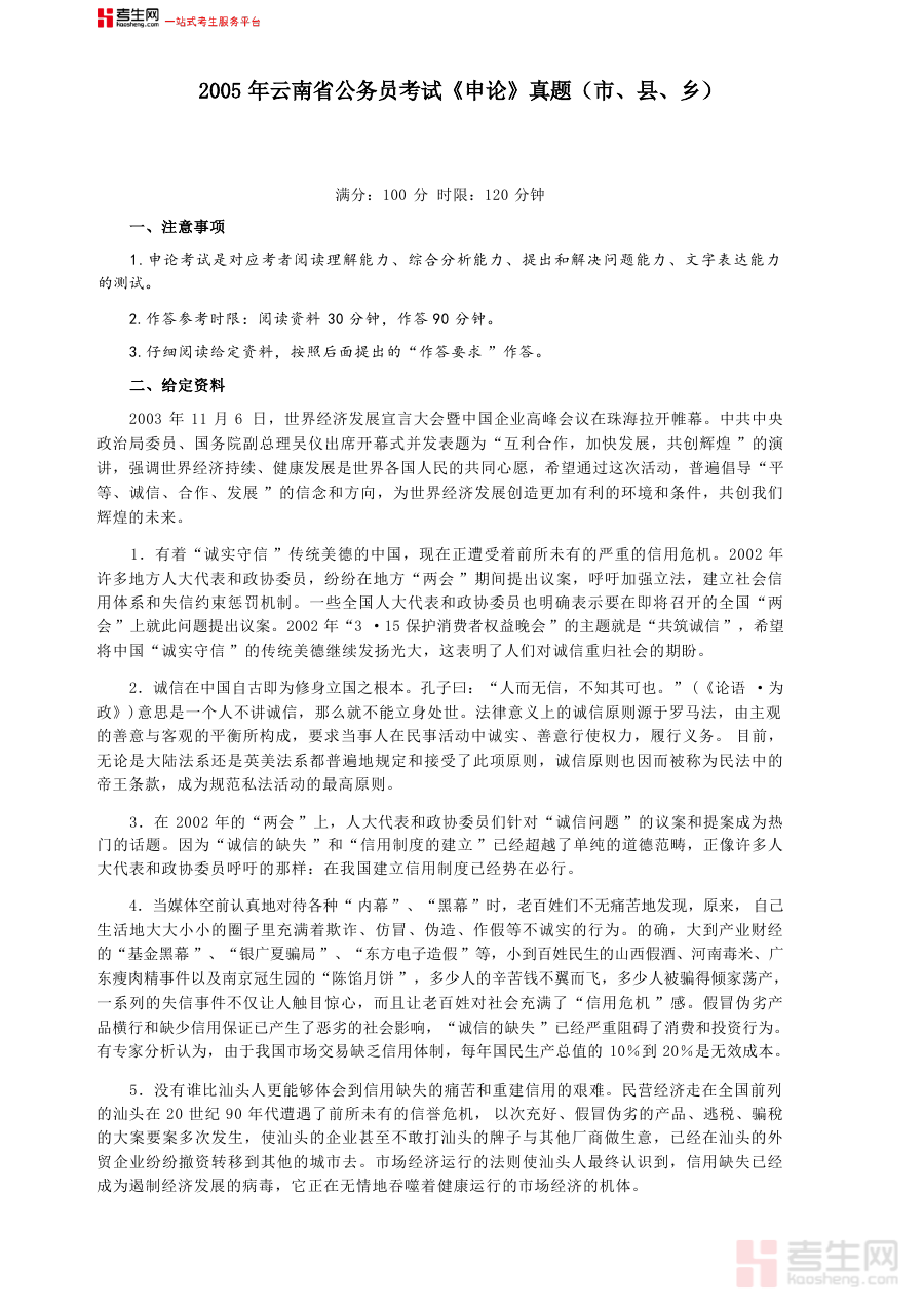 《2005年云南省公务员考试《申论》真题(市县乡)及参考答案》是一份针对2005年云南省市县乡层级公务员招录考试申论科目的备考资料,包含该年度对应层级考试的申论真题及官方或权威参考答案两部分,为备考者提供了直接参考该次考试实际命题情况的可靠依据。