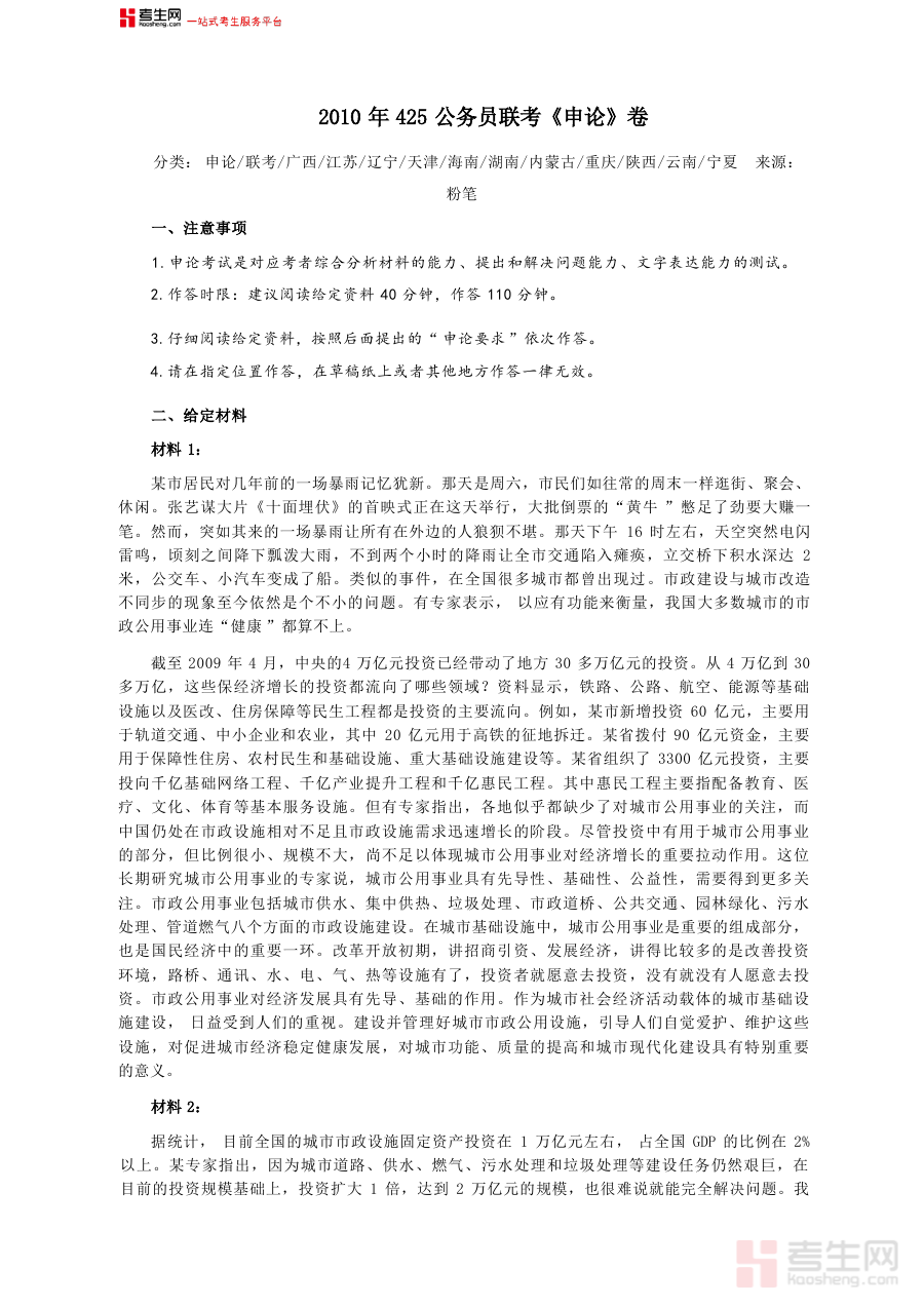 其适用人群包括计划参加2010年425公务员联考相关地区考试的考生,以及从事公务员考试辅导工作的教师或培训人员;对于考生而言,可借助这份资料进行自我检测,了解自身申论水平与差距;对于辅导人员而言,可将其作为教学素材辅助学员理解联考申论的考试特点与答题规范,具有较高的参考价值与实用意义。