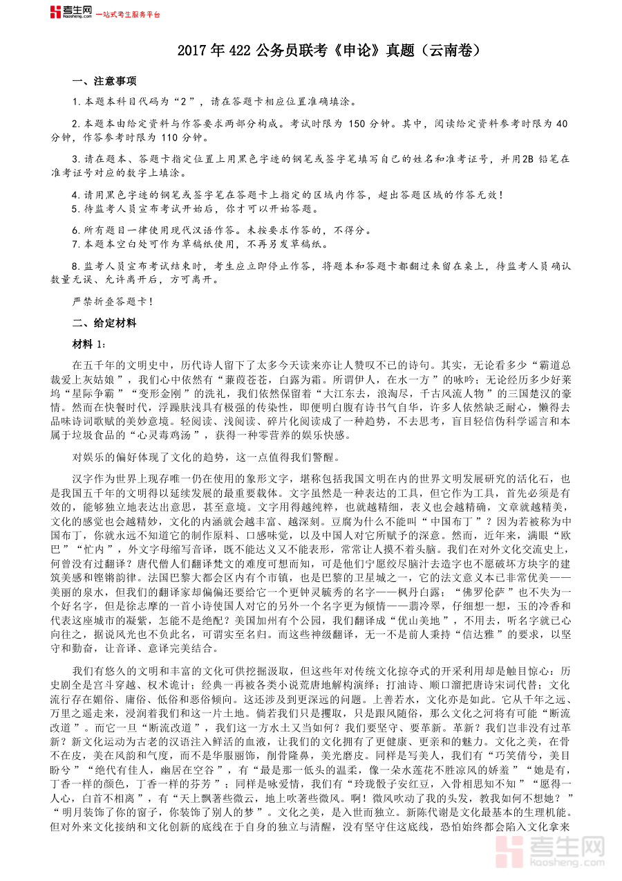 考生网是一站式考生服务平台,拥有唯一“考生”通用词拼音kaosheng.com,自带流量优势与品牌护城河。平台始终坚守发展普惠教育、促进教育公平的初心,致力于为各类考生提供优质便捷的备考资源与服务,打造共创共享的知识分享平台。这份《2017年422公务员联考《申论》(云南卷)真题答案及解析》正是考生网为满足公务员考试备考群体需求而提供的专业资料之一,体现了平台在助力考生高效备考方面的专业定位与服务理念。