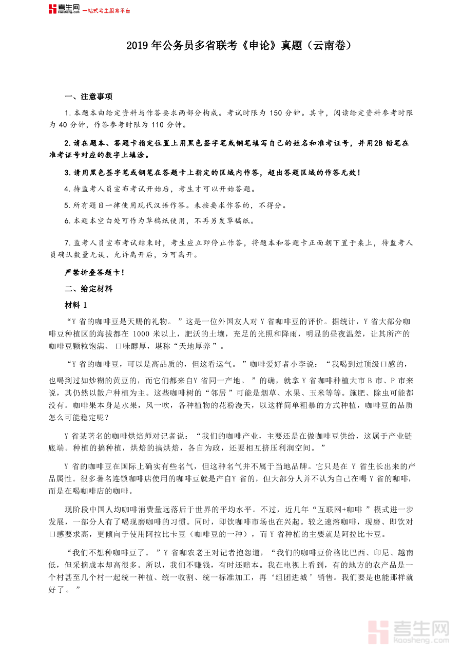 《2019年420联考《申论》真题(云南卷)及参考答案》是一份针对2019年云南省参加420联考申论科目的专业备考资料。该资料涵盖了该年度云南卷申论考试的完整真题以及官方或权威机构提供的参考答案,为备考者提供了直接接触考试原题和标准解答的机会,是联考申论备考阶段不可或缺的参考资源之一。