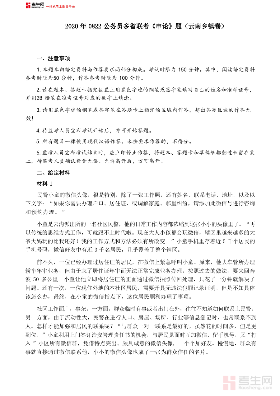《2020年0822公务员多省联考《申论》题(云南乡镇卷)及参考答案》是一份针对2020年8月22日公务员多省联考云南乡镇卷申论科目的备考资料,包含该场次考试的试题及对应的参考答案,为相关备考者提供了与考试实际题型和难度匹配的学习素材,是了解该次考试申论科目命题特点的重要参考资料。