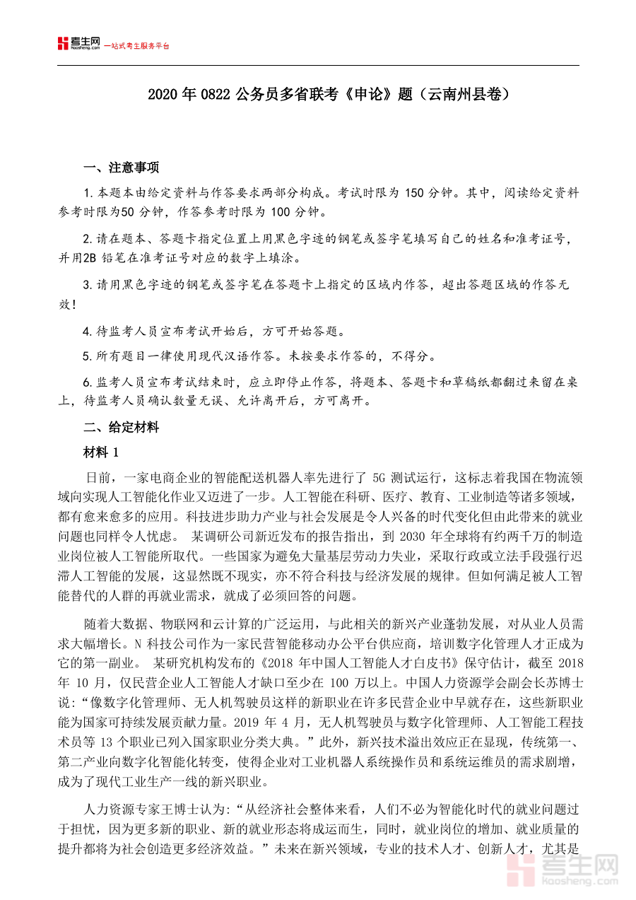 《2020年0822公务员多省联考《申论》题(云南州县卷)及参考答案》是一份针对2020年8月22日公务员多省联考云南州县卷申论科目的备考资料,包含该次考试的真题及对应的参考答案两部分核心内容,紧密贴合云南州县公务员岗位的申论考查需求,为相关备考者提供了直接关联该考试的权威参考依据。
