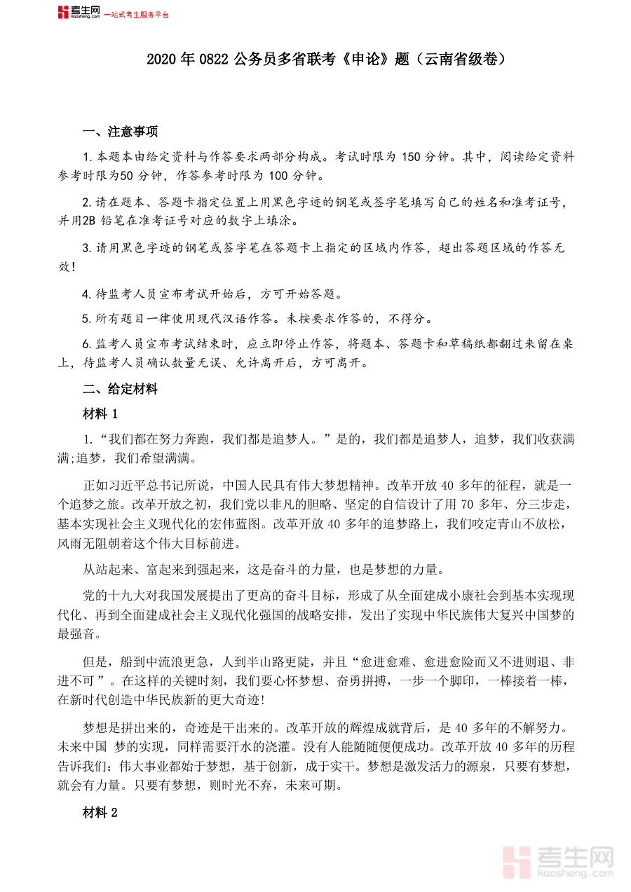 《2020年0822公务员多省联考《申论》题(云南省级卷)及参考答案》是一份针对2020年8月22日公务员多省联考云南省级卷申论科目的专业备考资料,包含该次考试的完整真题及对应的参考答案,为考生提供了直接对接考试实际内容的权威参考依据。
