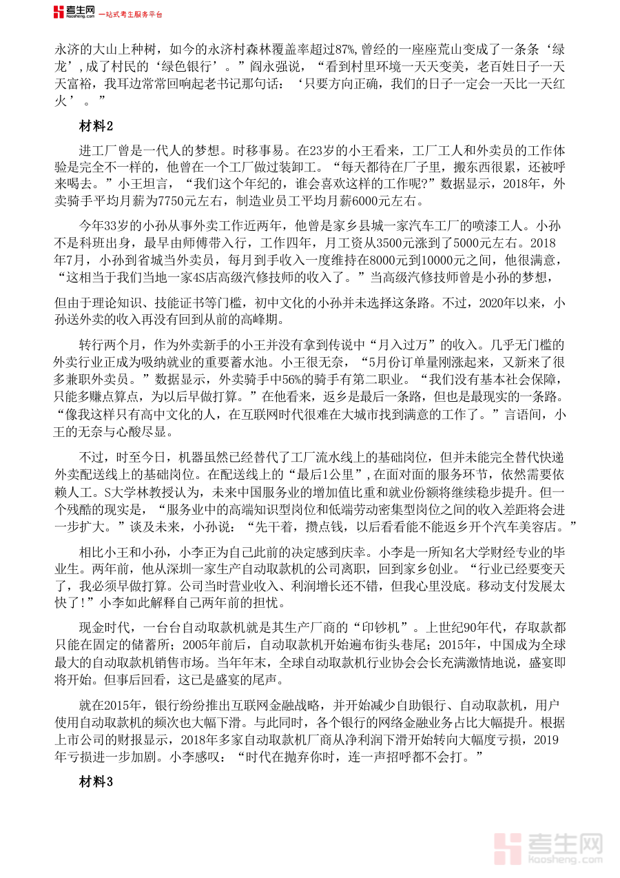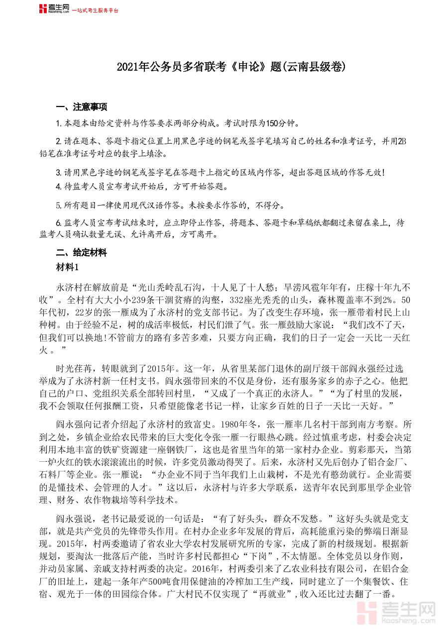 这份《2021年公务员多省联考《申论》题(云南县级卷)及参考答案》由考生网提供。考生网是一站式考生服务平台,拥有唯一“考生”通用词拼音kaosheng.com,自带流量,自带护城河,坚守发展普惠教育、促进教育公平初心,打造共创知识分享平台。通过考生网的资源整合能力,考生能便捷获取各类精准适配的备考资料,为自身考试准备提供有力支持与保障。