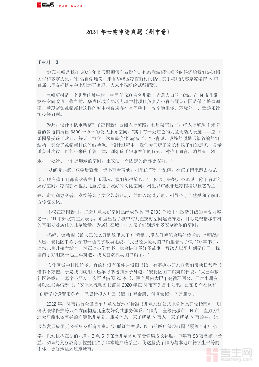 本资料的适用人群为计划参加2024年云南省州市级申论考试的考生群体,以及从事申论考试辅导的教师、培训机构工作人员。对于考生而言,它是还原真实考试场景、检验知识储备与答题能力的关键资料;对于辅导人员来说,它可作为教学案例分析与备考方案设计的重要参考依据。其真题属性确保了内容的权威性与针对性,是备考过程中不可或缺的核心资源,能有效助力备考者提升应试竞争力。