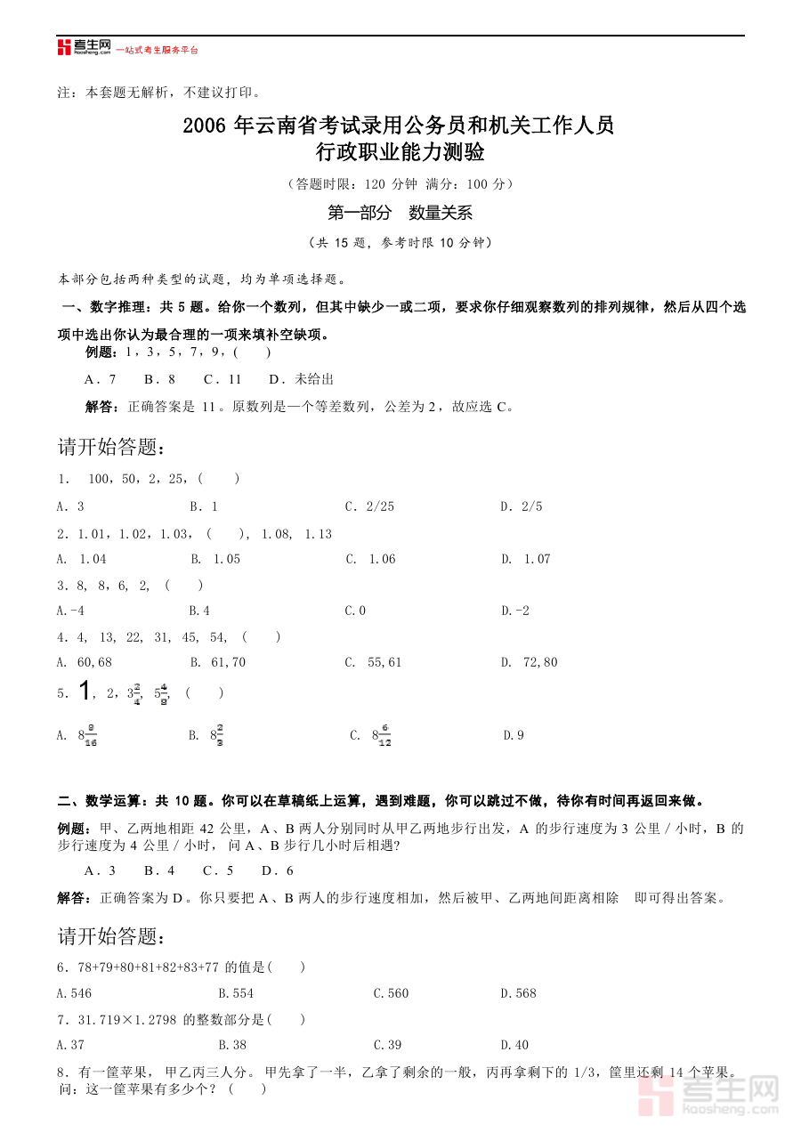《2006年云南省公务员考试《行测》真题及答案(无解析,不建议打印和练习)》是一份针对2006年云南省公务员录用考试行政职业能力测验科目的备考资料,包含该年度考试的真题及对应答案,为相关使用者提供了了解当年考试命题情况的参考载体,其信息直接关联该年度云南省公务员行测考试的官方内容,具备一定的历史参考性。