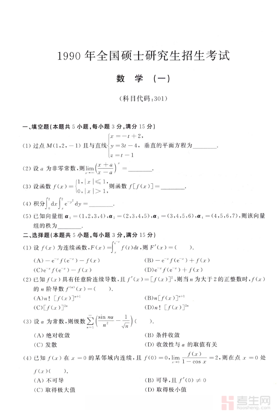 《1990年考研数学(一)真题》是1990年中国研究生入学考试数学科目(一)的官方真题资料,属于针对该年度考研数学(一)科目的核心备考资源。它反映了当年考研数学(一)命题的整体方向与考查要求,是研究该科目历史命题规律、把握考试形式的重要素材,能够为备考者提供对考试内容与结构的基础认知,帮助其初步建立对考研数学(一)的整体理解框架。