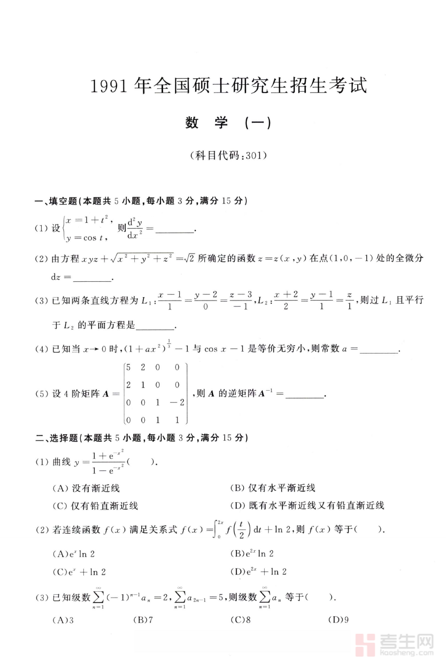 《1991年考研数学(一)真题》是1991年全国硕士研究生招生考试数学科目第一类试卷的官方原题集合,属于国内研究生入学考试备考体系中的经典资料。作为具有年代参考意义的真题文本,它不仅反映了当年考研数学(一)科目的考查范围与命题风格,还是研究考研数学命题历史演变规律的重要原始素材之一,对理解早期研究生数学考试的特点具有不可替代的价值。