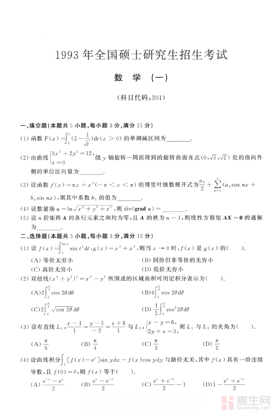 《1993年考研数学(一)真题》是1993年全国硕士研究生入学统一考试数学科目中数学(一)科目的官方考试真题资料。作为考研数学备考体系中的核心参考资料之一,它集中体现了当年考研数学(一)的命题方向与考查要求,是反映该年度研究生数学入学考试特征的重要历史文献,对后续备考具有不可替代的参考价值。