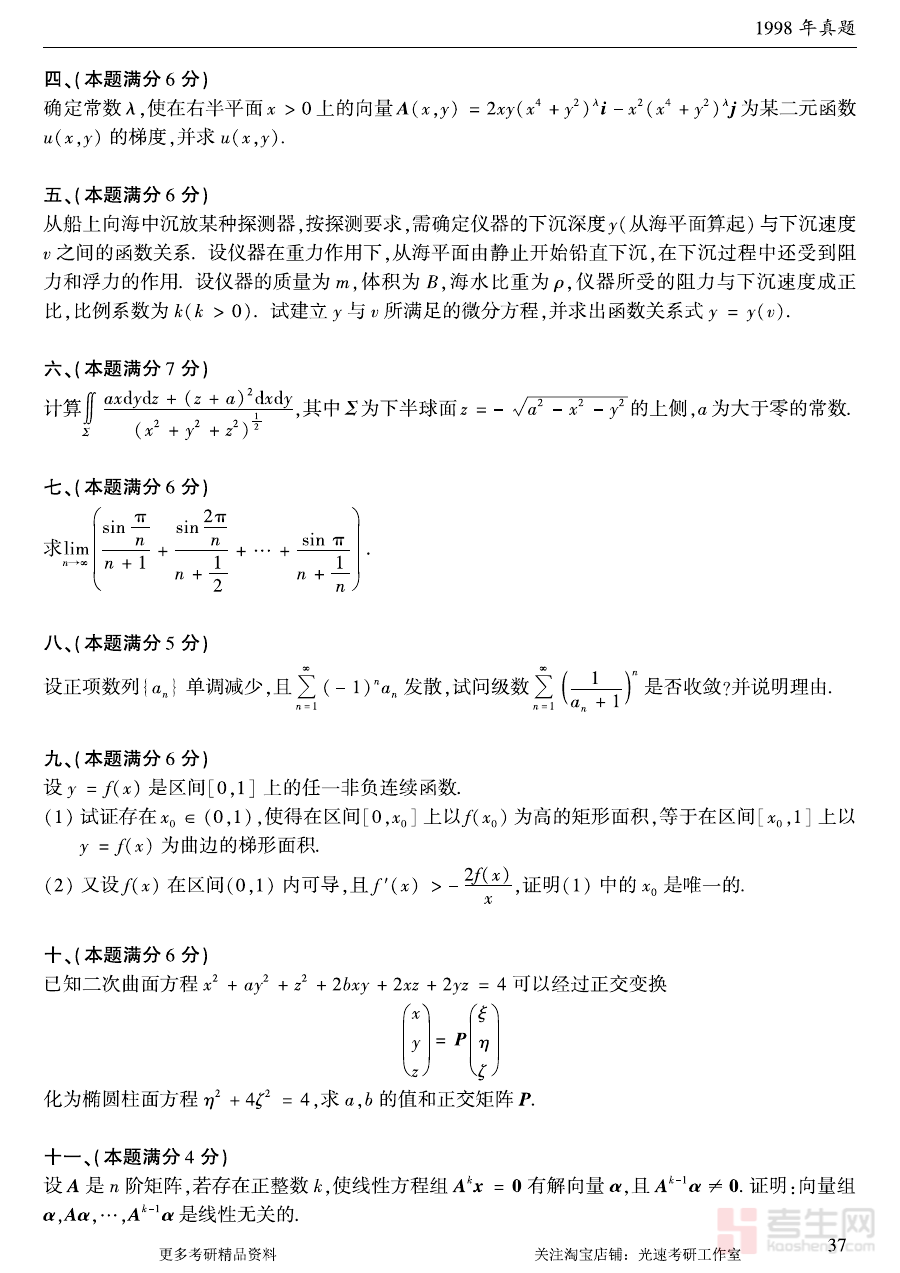《1998年考研数学(一)真题》是1998年中国硕士研究生入学统一考试数学科目中数学一方向的官方真题汇编,作为考研数学备考领域的经典资料,它严格遵循当年考试大纲要求,能够直观反映当时数学一考试的命题逻辑与考查重点,为备考者提供了解历史考试形态与命题趋势的核心依据。