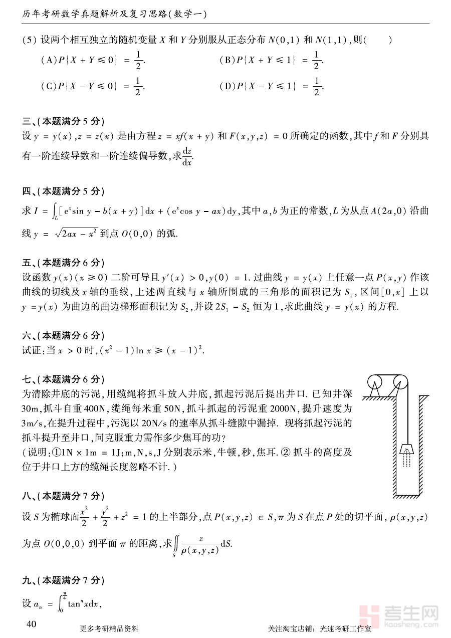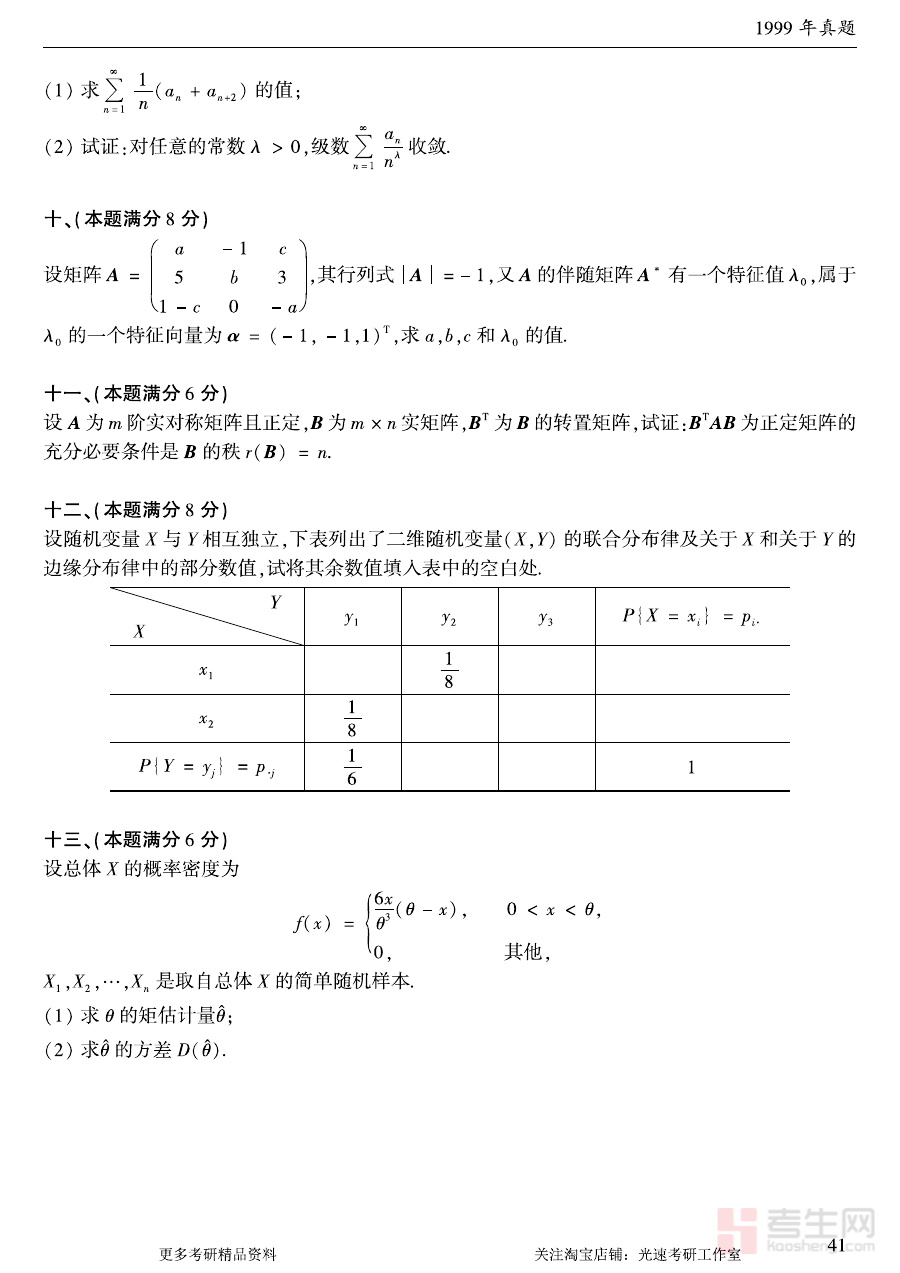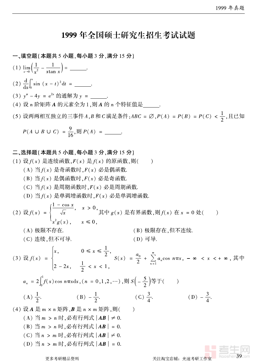 《1999年考研数学(一)真题》是1999年中国全国硕士研究生招生考试数学科目中数学(一)科目的官方真题资料,作为该年度考研数学(一)备考的核心参考素材之一,它完整保留了当年考试的命题结构与考查方向,为备考者提供了贴近真实考试情境的练习载体,是了解考研数学(一)历史命题规律、把握考试核心脉络的重要资料。