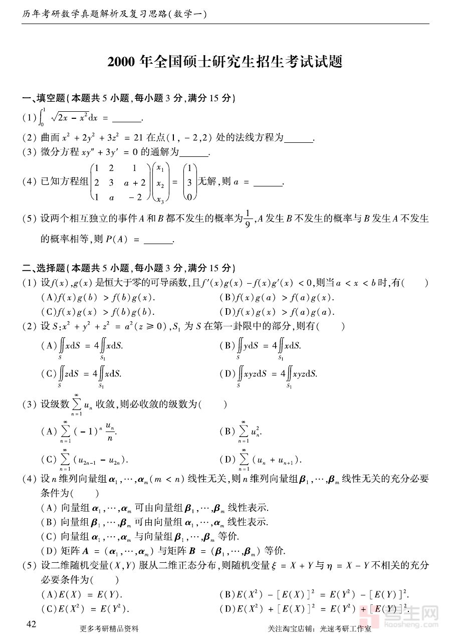 《2000年考研数学(一)真题》是2000年度中国硕士研究生入学统一考试数学(一)科目的官方真题资料,作为研究生招生考试数学学科的核心备考资源之一,它精准反映了当年该科目考试的命题方向与考查框架,为考生提供了贴合实际考试场景的原始参考依据。