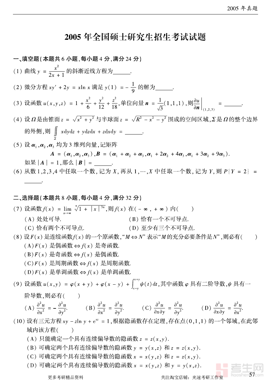 《2005年考研数学(一)真题》是2005年全国硕士研究生招生考试数学科目中数学一的官方考试题目汇编,作为硕士研究生招生考试备考体系里的关键资料之一,它精准呈现了当年数学一考试的命题逻辑、考查重点与试卷结构,是考生了解该科目考试特点及命题趋势的重要依据。