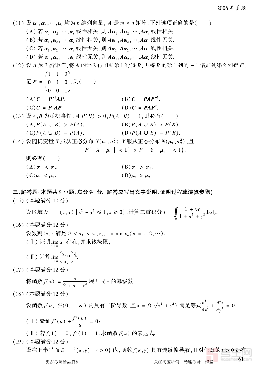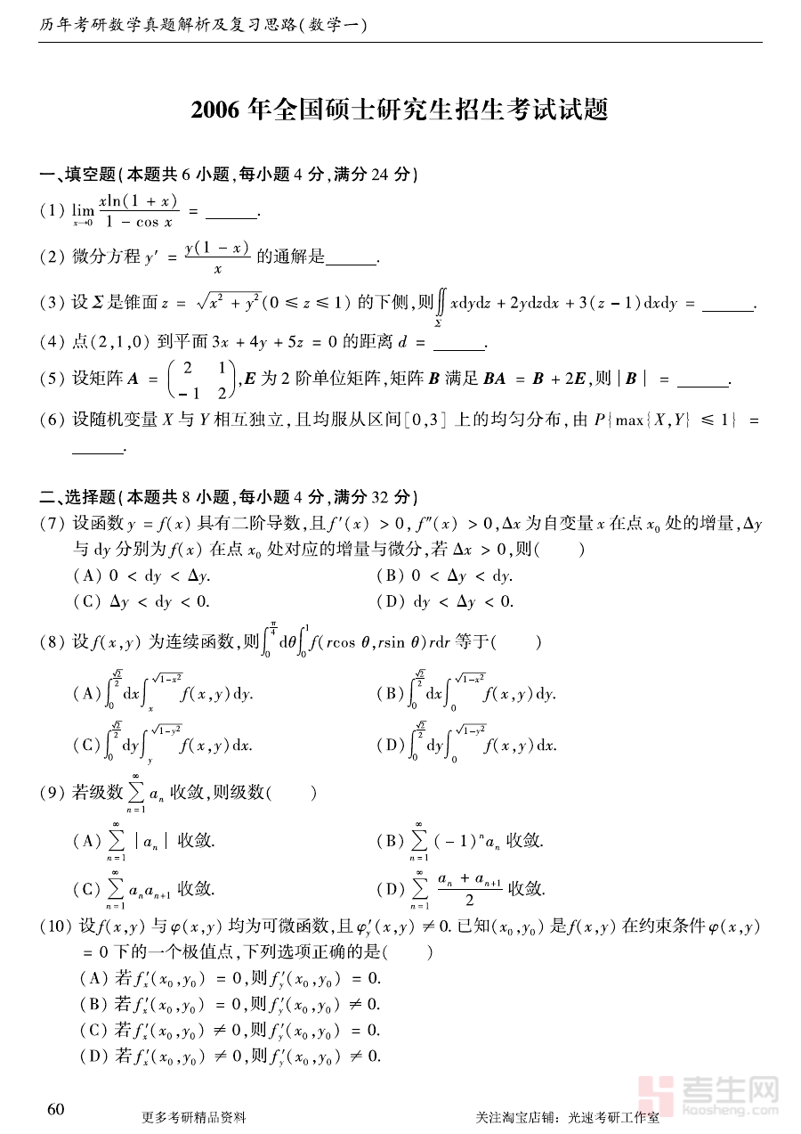 《2006年考研数学(一)真题》是2006年中国硕士研究生招生考试数学科目中针对数学(一)科目的官方考试原题,是研究生入学考试备考阶段不可或缺的核心资料之一,能够直接反映当年数学(一)科目的考试要求与命题方向,对考生了解考试形式与内容具有重要意义,也是历年考研数学备考资料中具有参考价值的经典真题之一。