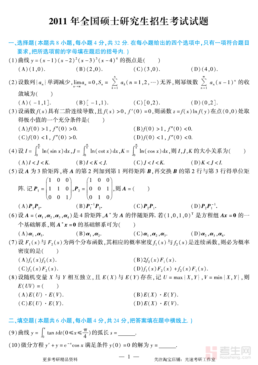 《2011年考研数学(一)真题》是2011年全国硕士研究生招生考试数学(一)科目的官方考试原题汇编。作为硕士研究生入学考试的重要备考资料之一,它承载了当年数学(一)科目的考试命题方向与考查重点,能够帮助考生直观了解该年度考试的整体框架与命题逻辑,是考生回顾历年考试趋势、把握学科考查规律的重要素材,为后续的系统性备考提供具有实际参考价值的依据。