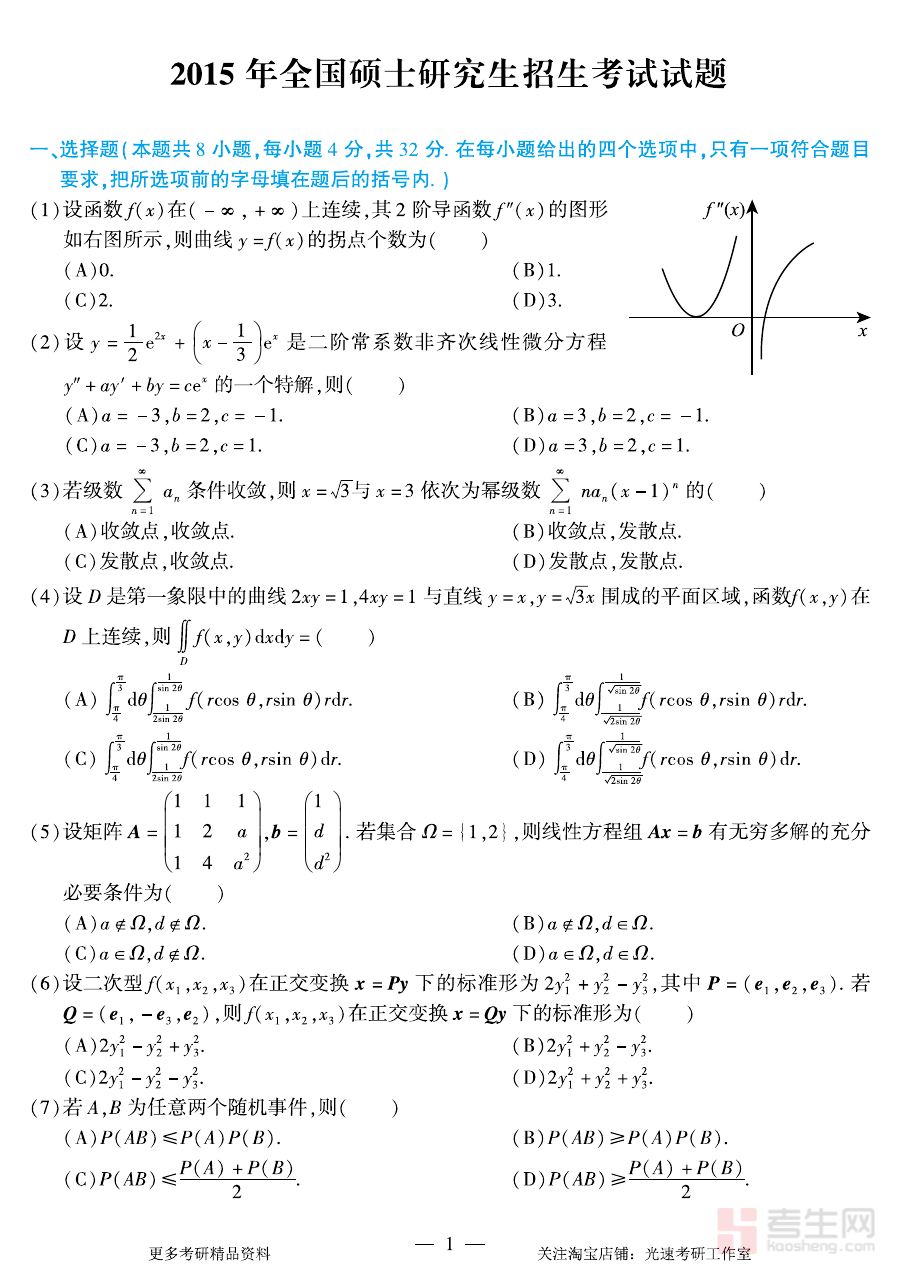 《2015年考研数学(一)真题》是2015年全国硕士研究生招生考试数学科目中数学一的官方真题资料,作为研究生入学统一考试的核心备考资源之一,它是考生了解该年度数学一考试命题框架与考查方向的重要载体,对于考生熟悉考试整体结构与基本要求具有不可替代的作用,能够帮助考生快速建立对数学一考试的初步认知,为后续复习明确核心方向。