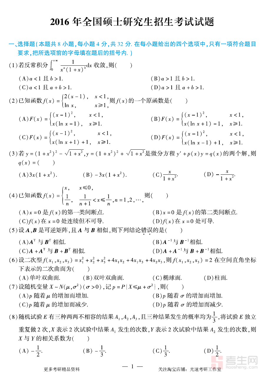 《2016年考研数学(一)真题》是2016年度全国硕士研究生招生考试数学科目(一)的官方真题资料,是研究生入学考试数学备考体系中具有权威性的核心参考素材。它直接反映了当年度考研数学(一)的命题方向与考查要求,为考生提供了贴近真实考试场景的复习依据。