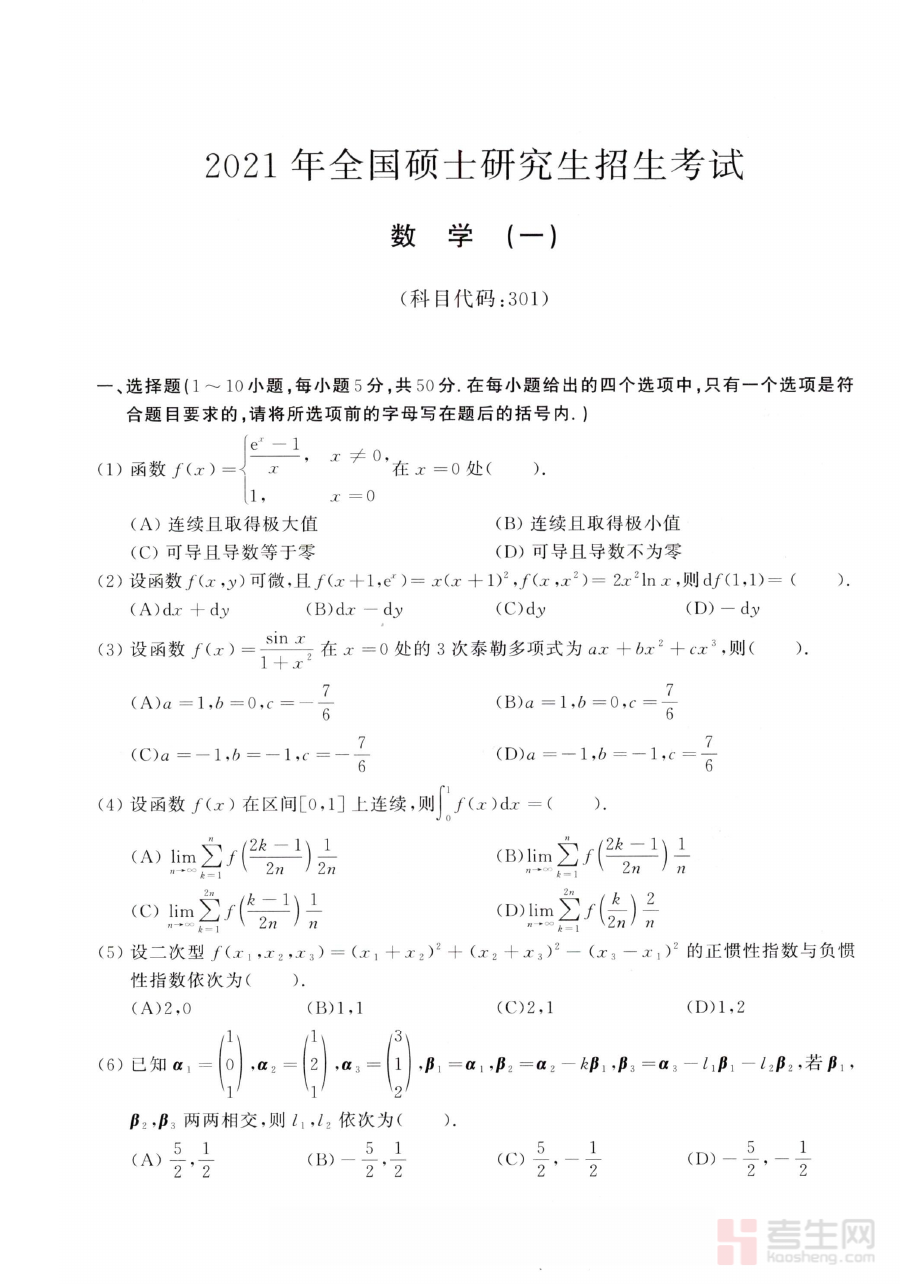 《2021年考研数学(一)真题》是2021年度中国研究生入学统一考试数学科目(一)的官方试题集合,属于国内研究生入学考试备考体系中的核心资料类型。该真题直接反映了当年数学一考试的命题导向与考查标准,是考生了解考试形式、内容框架及命题规律的重要依据,对于构建科学的备考思路具有基础支撑作用。
