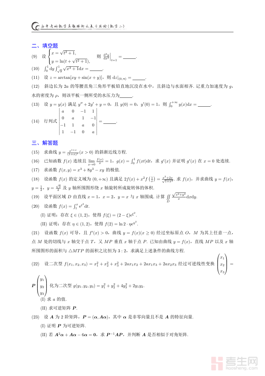 该资料主要用于考研数学二考生在备考过程中熟悉考试题型结构、把握命题规律与难度水平、检验自身知识掌握程度,帮助考生调整备考策略,明确学习重点方向,是考生了解考试要求和提升应试能力的重要依据。