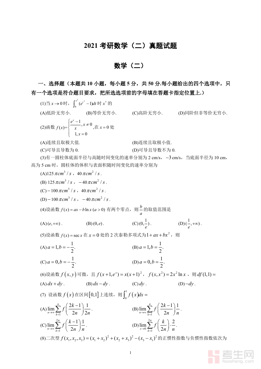《2021考研数学二真题》是一份针对2021年全国硕士研究生招生考试数学二科目的官方真题资料,精准对应该年度该科目的考试要求与命题方向。