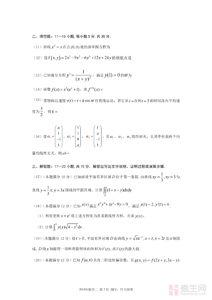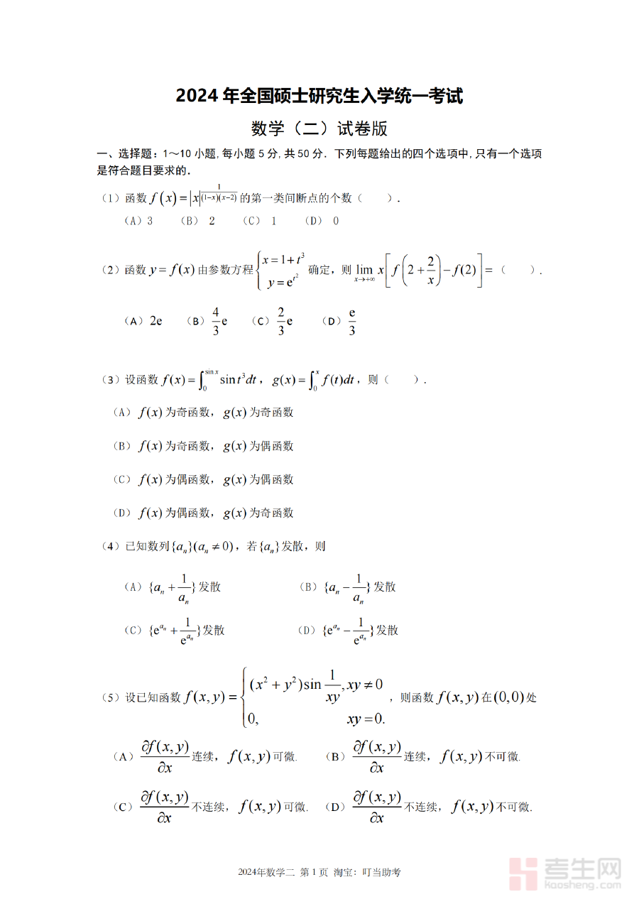 《2024年考研数学二真题》是一份针对2024年全国硕士研究生招生考试数学二科目的官方真题资料,由教育部相关命题单位组织命制,是考研数学二考试的权威参考依据之一。