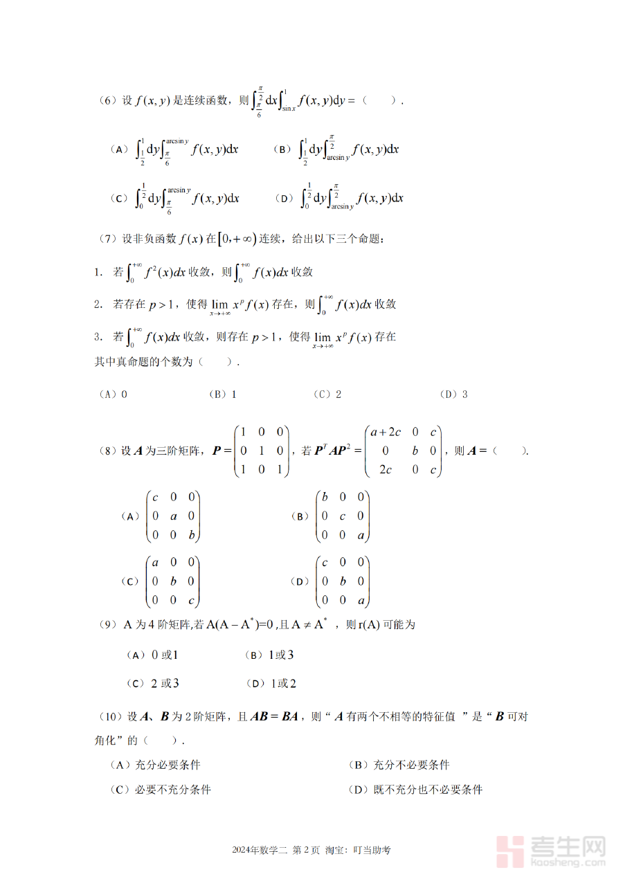 该资料适用于2024年硕士研究生招生考试中选择数学二科目的备考考生,也可为从事考研数学二辅导工作的教师及相关教育机构提供命题参考与教学素材,作为备考阶段重要的检测工具,助力考生了解自身复习情况并明确后续提升重点。